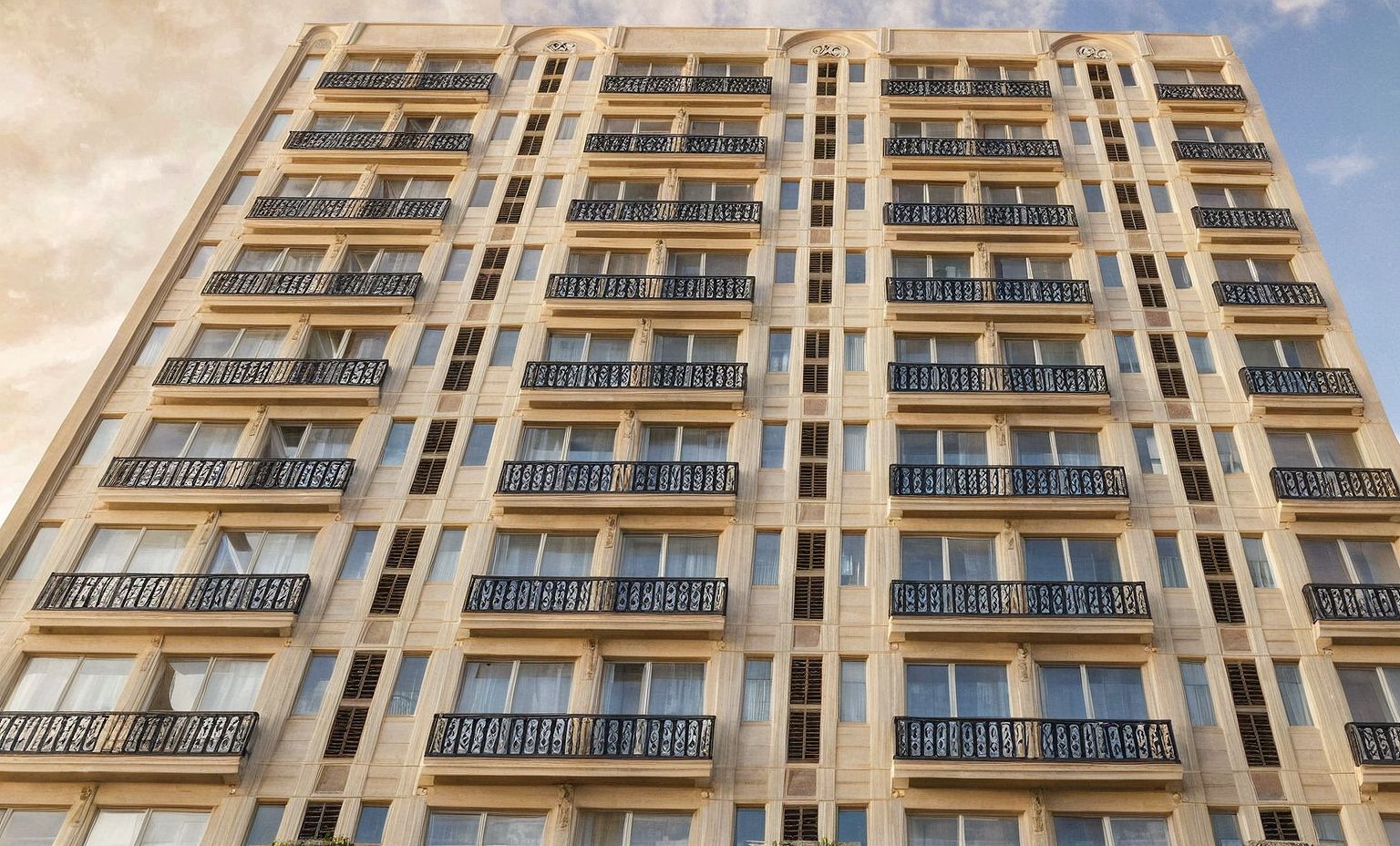 Photo of a high-rise residential building featuring intricate facade details, large glass windows, and decorative balconies adorned with greenery. Surrounded by a vibrant urban landscape, with nearby structures reflecting a modern city environment. Captured during golden hour, natural sunlight casts soft shadows and highlights across the building’s exterior. Perspective from a low angle, creating an imposing view, with a wide-angle lens to showcase the structure's height and architectural complexity.