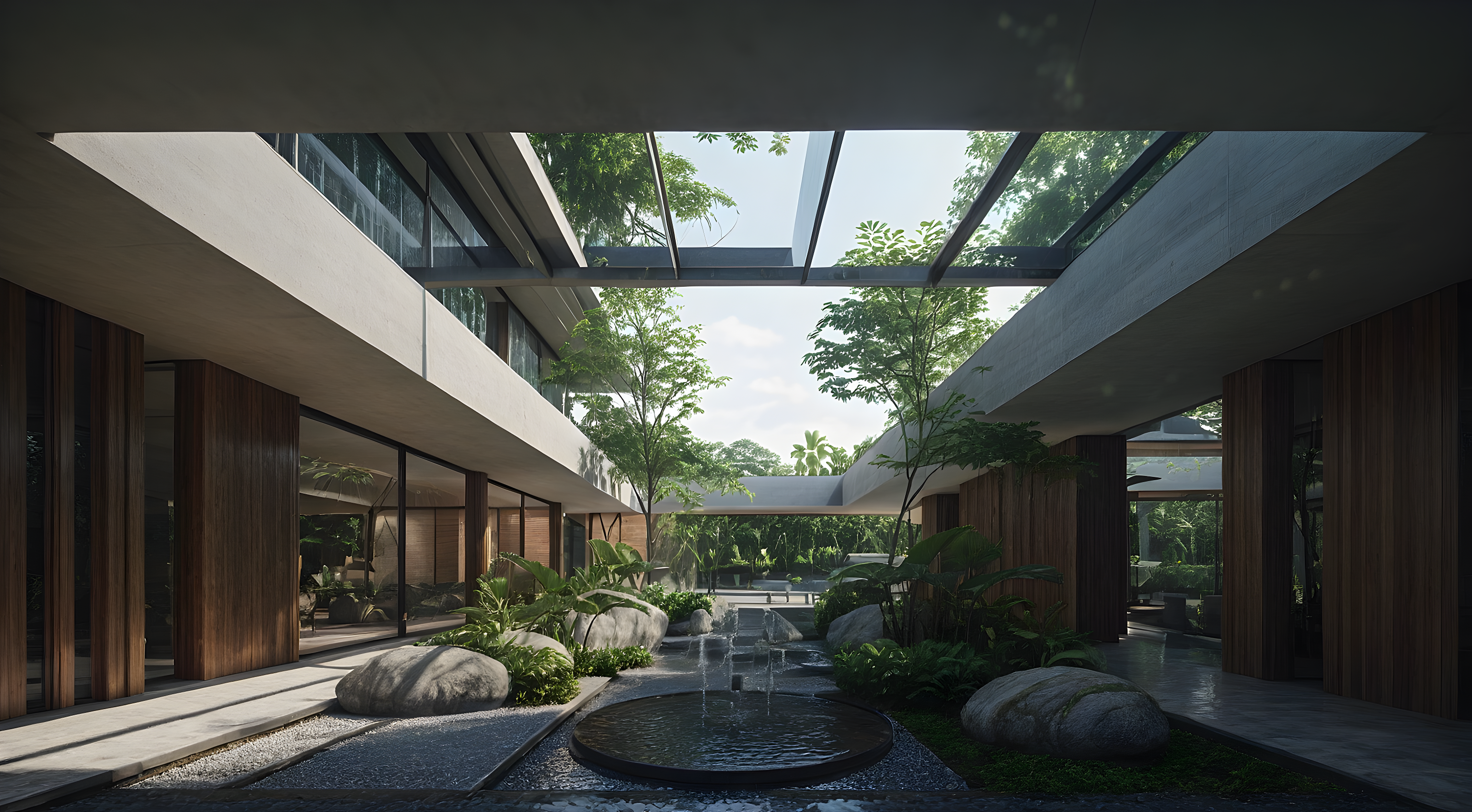 PromptDaylight mood rain forest landscape tall trees in courtyard with central water feature