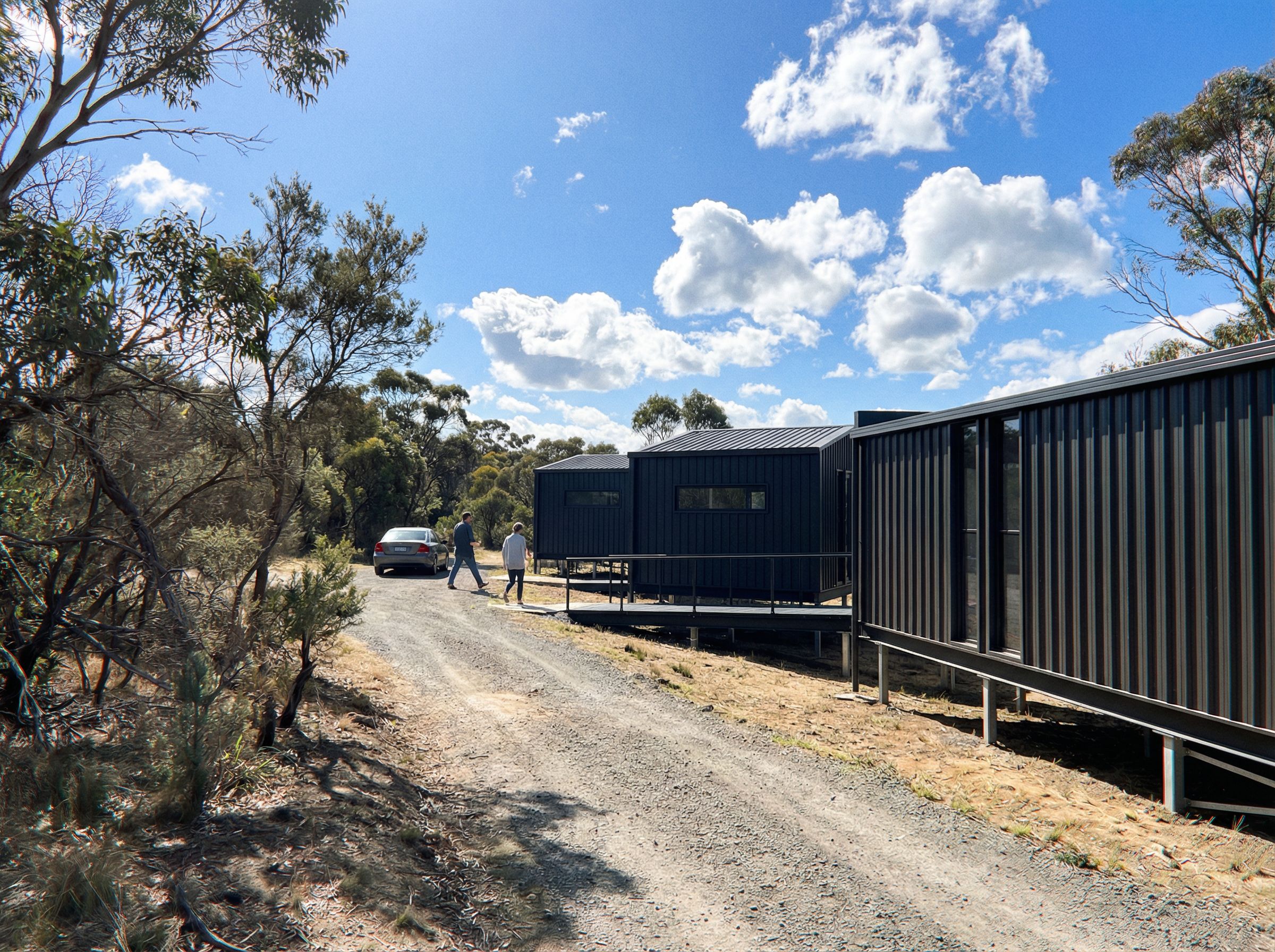PromptDark vertical metal sheet cladding cabins to wall and roof, steel deck with FRP decking dark, keep form, siting is a landscape sloped site, cabins low in landscape surrounded by dry trees, exposed steel columns, informal loose gravel track, view along track, keep forms of rectangles, green tube represent tree heights, pathway form track to cabins