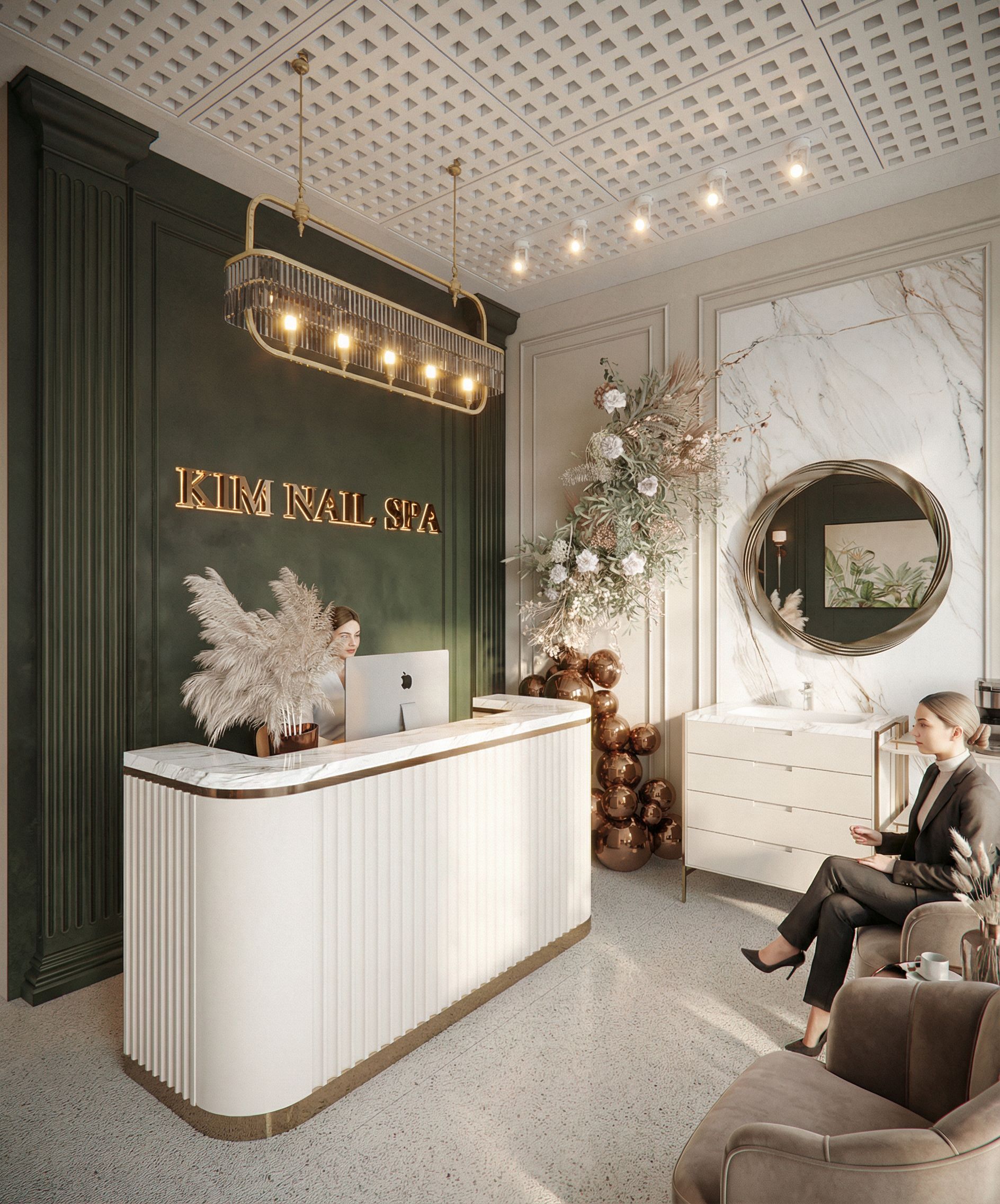 PromptThis photograph captures the interior of a modern salon, showcasing subtle architectural elements such as patterned ceilings and minimalist furnishings. The space utilizes soft, neutral tones, comfortable seating, and polished surfaces, complemented by lush greenery visible through large glass windows. Natural light floods the interior, creating gentle shadows and subtle accents. Shot from a wide angle, the composition emphasizes the open space and elegant design features, inviting viewers into a tranquil environment. The camera angle is maintained, preserving the architectural proportions and forms, as well as retaining the original materials, highlighting and depicting the textures as realistically as possible., keep exact camera angle
