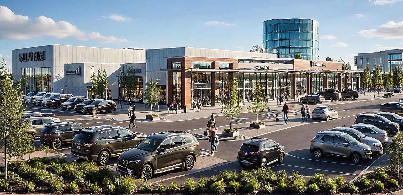 PromptPhoto of a modern shopping mall in an urban environment, featuring contemporary architectural elements with a sleek façade, large glass windows, and well-defined signage. Surrounding the mall are landscaped areas with greenery and small trees, alongside a spacious parking lot filled with vehicles and people. The scene is bathed in soft afternoon sunlight, creating dynamic shadows and highlights. Captured from a slightly elevated angle, the perspective reveals the grand entrance and pedestrian pathways, providing an inviting atmosphere for shoppers.
