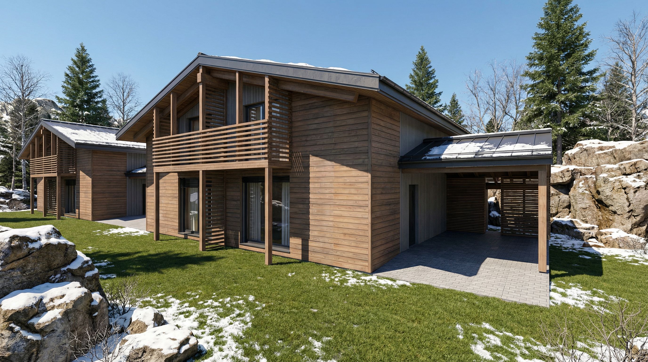 Promptarchitectural exterior rendering, render this sketch into photorealistic rendering, around trees and not too high mountain rocks, lights of a clear day some small snowy areas, lawn in front, keep exact camera angle, high quality, professional, detailed scene