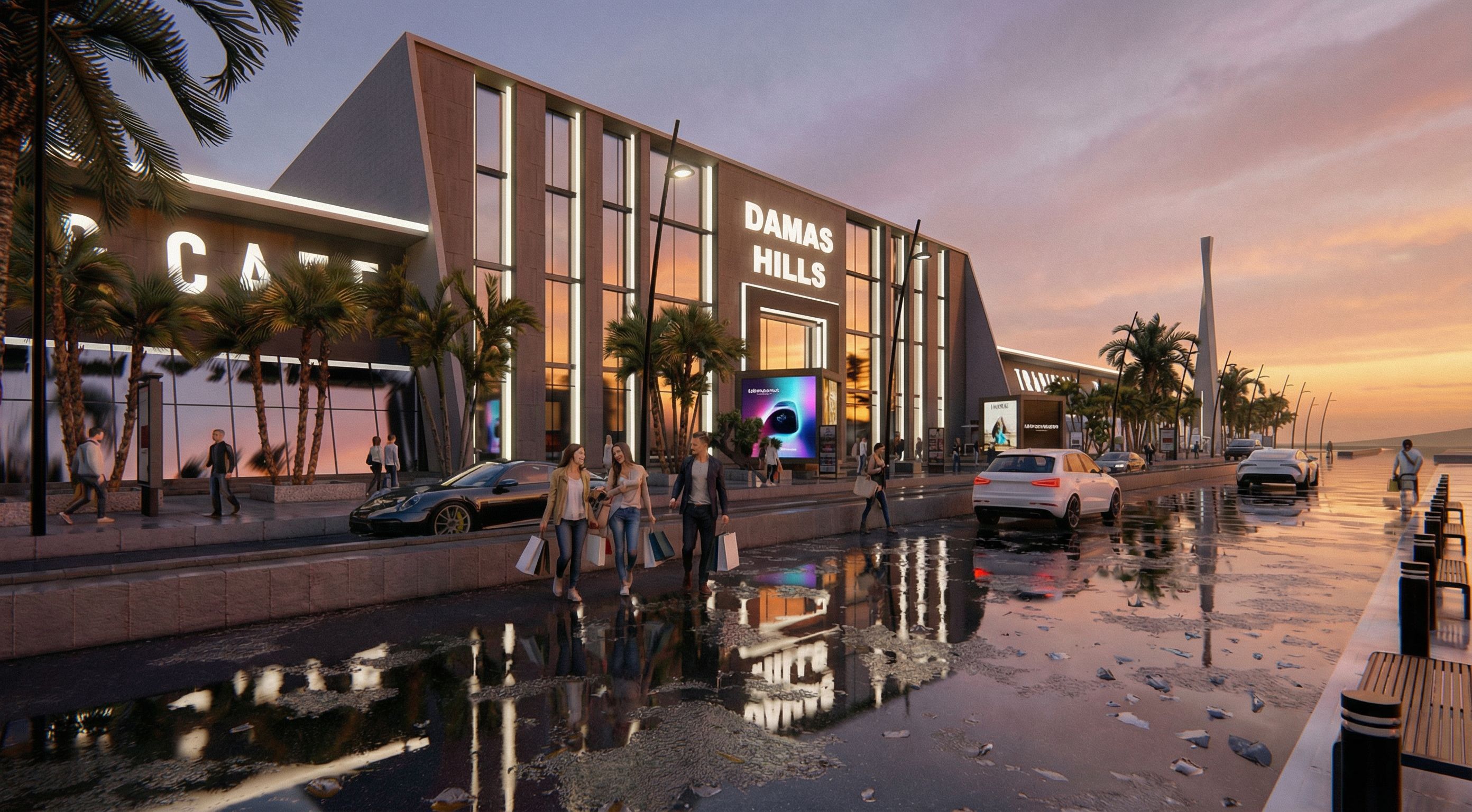 this is a facade of a mall make it more realistic in the morning.. make people comes out shopping and have fun ..and make pedestrians walk and interact.. the cars must look more real ... add ads on the cubes at the entrance of the mall , keep exact camera angle