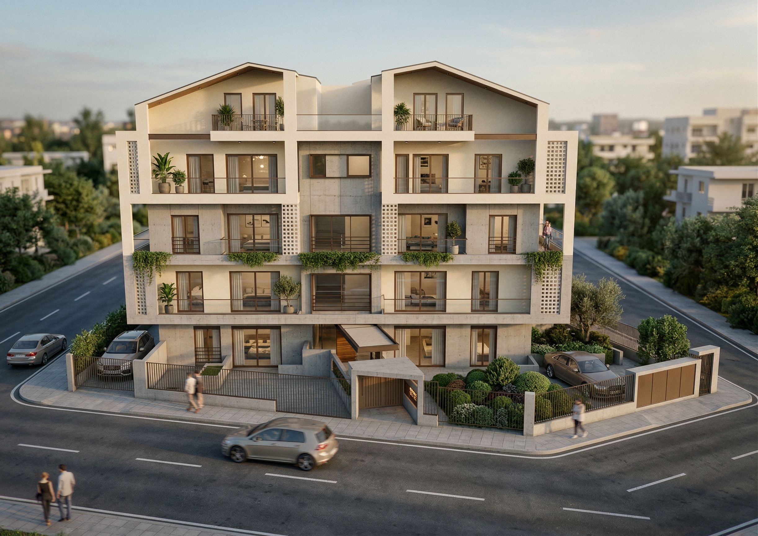 PromptModern block with large bronze windows, materials such as concrete,vanilla plaster,metal, Cement Breeze Blocks surrounded with greenery. Put at the left side in front of the left window a car . Also put at the left side of the building a car. Put at the right side in front of the big window a car and add besides this car a few bushes. Put in front of our building a road with a car., keep exact camera angle