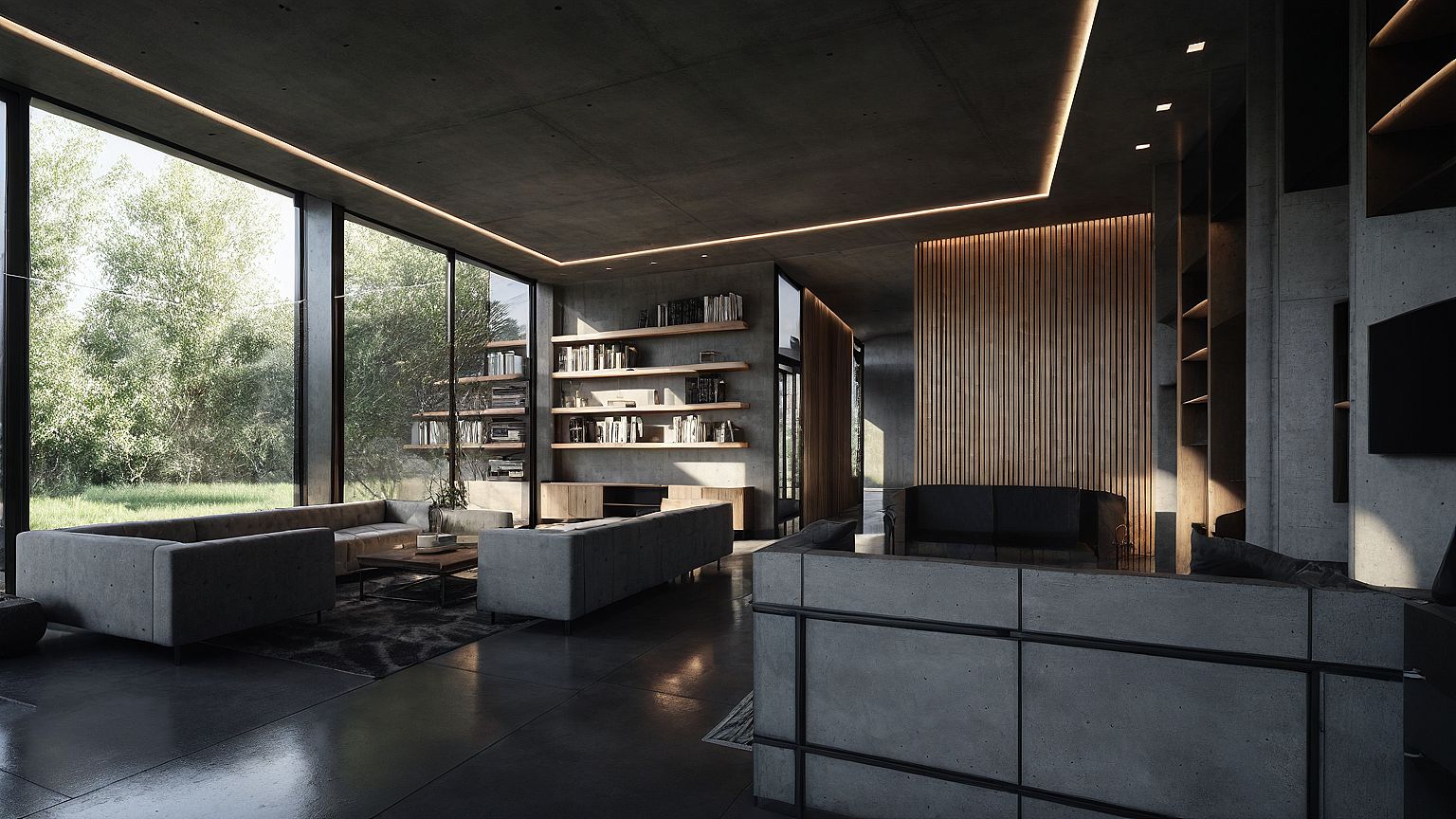 PromptMINIMAL HOuse. glass and concrete walls. concrete floor and ceiling. black windows frames. spots light on ceiling. light wood walls. concrete on the library. chrome. side wall