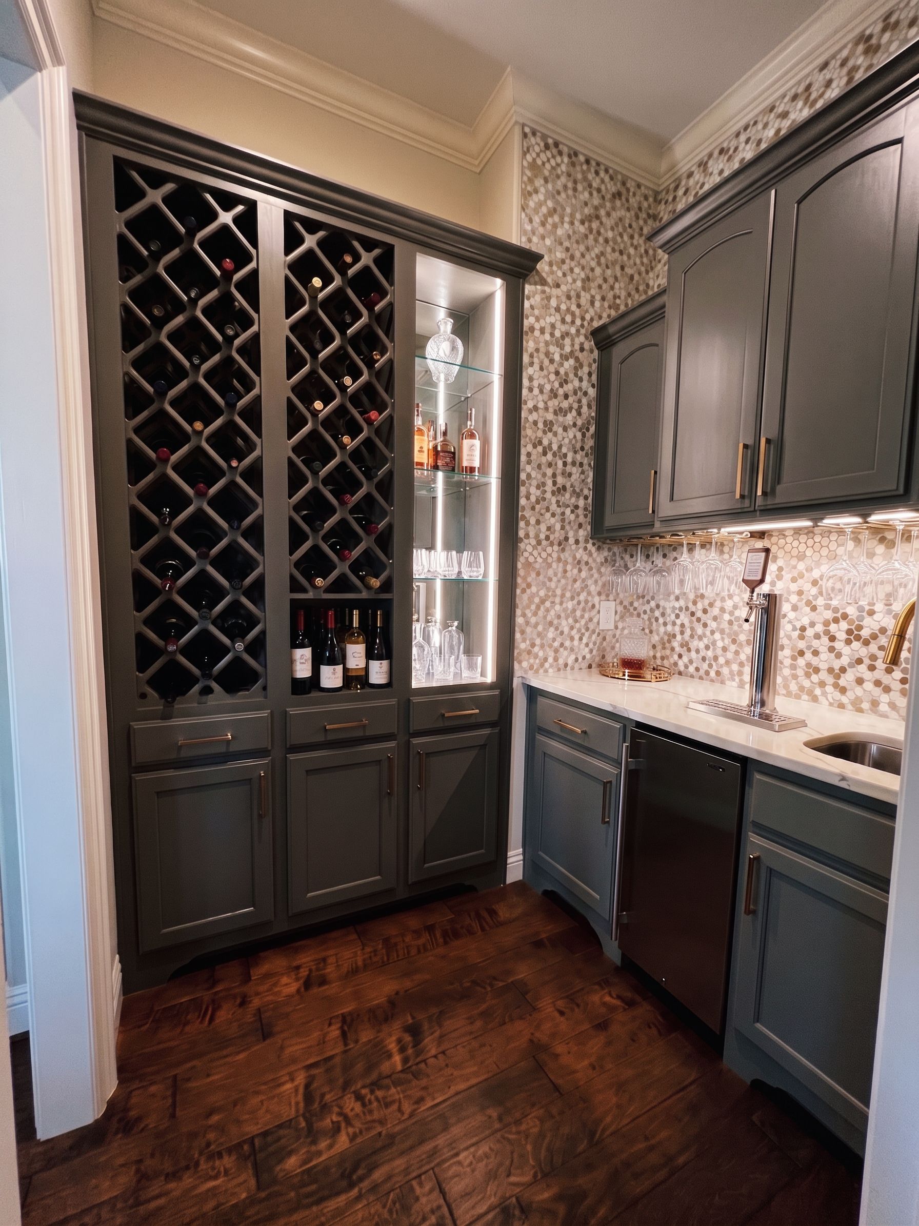 Promptmatch the gray color on the right side cabinetry to the same color as the cabinetry on the left. extend the tile all the way to the ceiling on the wall on the right side. keep. make no other changes. , keep exact camera angle
