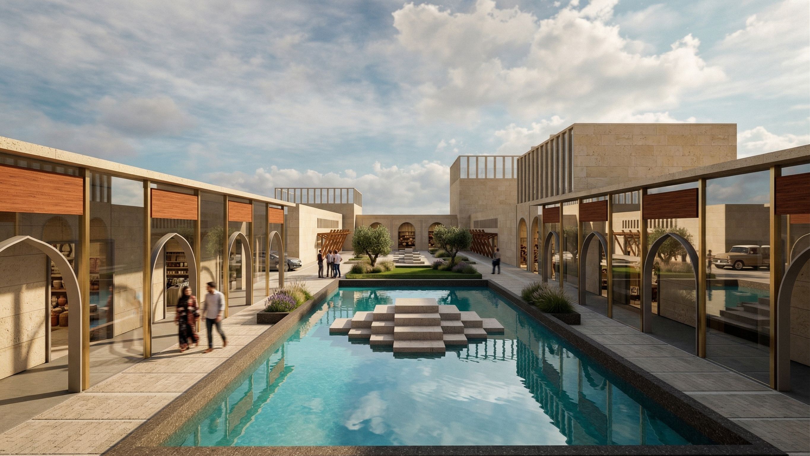 Enhance this architectural render of a handicrafts market that showcases traditional crafts in a contemporary way. Keep the original design completely unchanged: • do not modify the building’s form, massing, proportions, facade, or architectural composition • keep the exact same camera angle and perspective Improve materials and realism: • clad the main building with elegant beige natural stone with subtle texture and realistic imperfections • enhance all materials to be highly photorealistic glass reflections, stone roughness, shadows, depth Site and landscape enhancements: • preserve the existing layout exactly as is • replace green-marked areas with trees and soft landscaping • replace blue-marked areas with realistic water features reflective, slightly dynamic surface • add realistic people walking, gathering, and enjoying the outdoor courtyards • add cars in streets and parking areas natural distribution, not crowded Lighting and environment: • enhance sunlight to natural warm daylight with soft shadows • improve sky and weather for a clean, realistic atmosphere • use global illumination and high dynamic range lighting Rendering quality: • ultra photorealistic • high resolution 4K or higher • cinematic composition • sharp details, realistic depth of field, keep exact camera angle