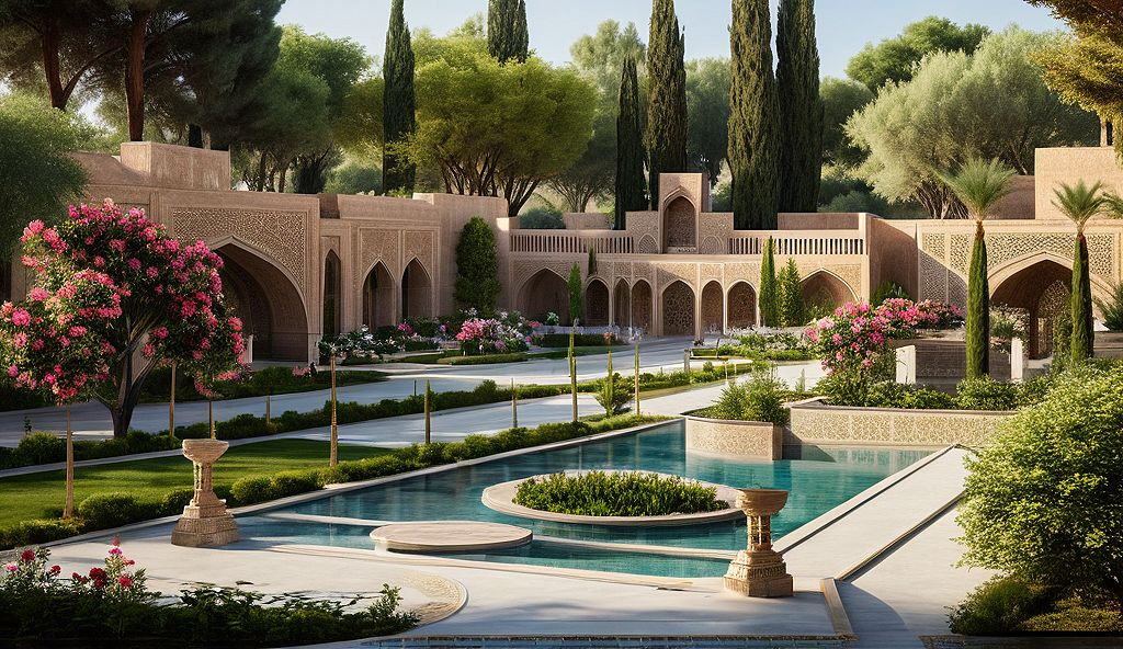 Prompt“A detailed and atmospheric rendering of the Iranian Art Garden Museum, designed in a fully traditional Persian style. Lush Persian gardens with symmetrical layout, turquoise tilework, carved wooden doors, stucco ornaments, brick arches, traditional water channels (jubes), fountains, and reflective pools. Include cypress trees, roses, and Persian geometrical patterns. Warm natural light, realistic shadows, calm ambiance, and authentic Iranian architectural elements inspired by Safavid and Qajar eras. High-resolution, ultra-realistic, deep textures, intricate details, and soft daylight.”