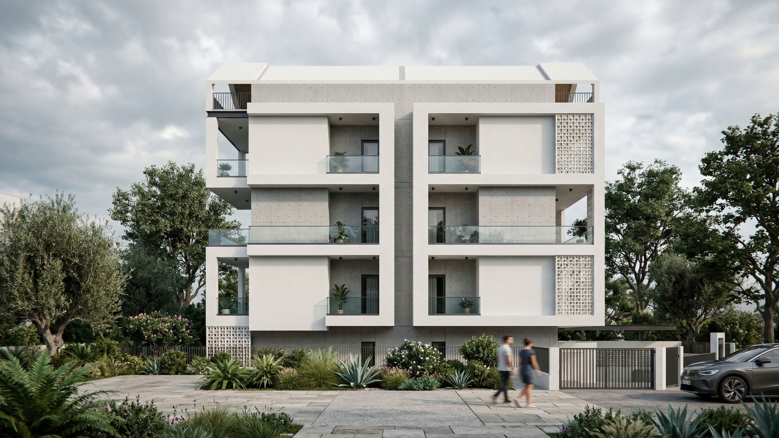 PromptModern block with large windows, materials such as concrete,plaster,metal, white clauster surrounded with greenery.With no pool!!!, keep exact camera angle