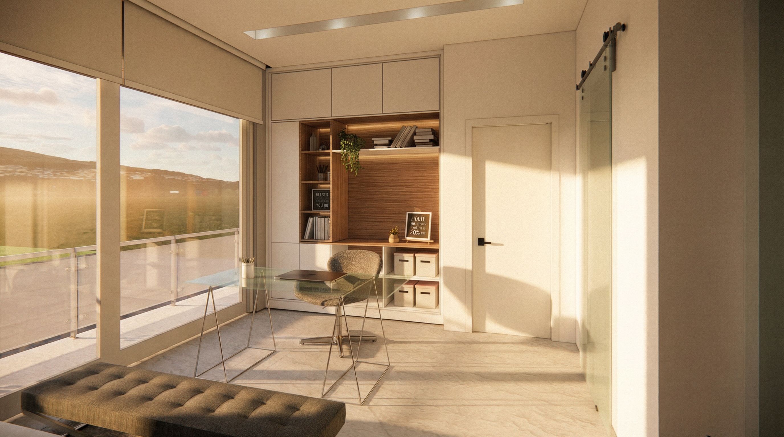CREATE A LIGHT GOLDEN HOUR ATMOSPHERE. You are professional photographer and expert architect, you role is to transform the input into realistic photograph and add photography effects like chromatic abberation, ISO noise, Film grain, Sharpening pass, Soft glow, Exposure correction, Tone mapping, Bloom + glare mix, keep exact camera angle, keep exact camera angle