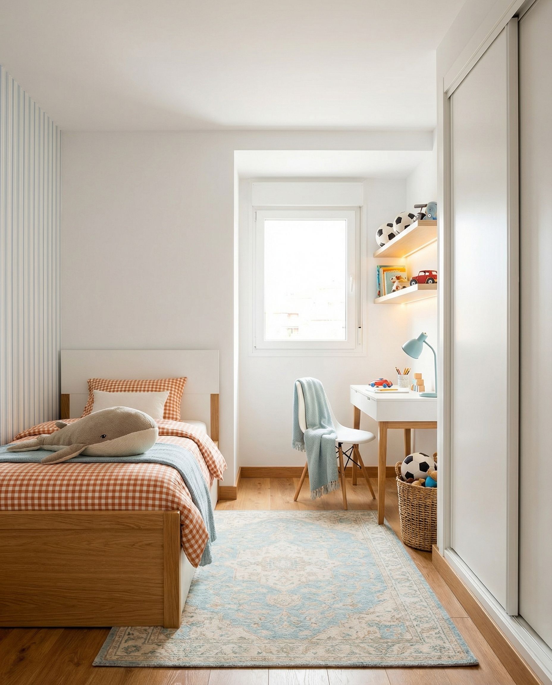 Prompthabitación de un niño pequeño. suelo de madera de roble. paredes blancas y techo blanco. pared del cabecero de la cama con un papel pintado con lineas azules Claritas y blancas. cama individual con estructura de la cama de madera de roble, la cama esta pegada a la pared de la izquierda. cabecero de la cama blanco. la ropa de la cama será como la imagen de referencia. la ventana de la pared del fondo no esta en la misma pared que el cabecero de la cama, esta en una pared mas atrás, la segunda imagen de referencia que pongo es la forma de la habitación vista desde arriba. tiene una carpintería de pvc blanca. los rodapiés de toda la habitación son del mismo material que el suelo. al lado de la ventana contra la pared hay un escritorio con las patas de madera y la parte superior de color blanco. la silla del escritorio tiene las patas de madera y la silla blanca, encima de la silla se encuentra una manta colgada de color azul clarito. el escritorio tiene un flexo azul clarito y encima del escritorio hay dos estanterías con luces led indirectas cada balda, con elementos de decoración de un niños pequeño (juguetes, cosas de futbol, coches, libros...). al lado del escritorio hay una cesta de mimbre con juguetes y un balón de futbol. en el suelo hay una alfombra de color azul clarito y beigue. al lado del escritorio se encuentra el armario blanco, es corredero y va de suelo a techo. entra luz natural por la ventana y hay luces calidas.