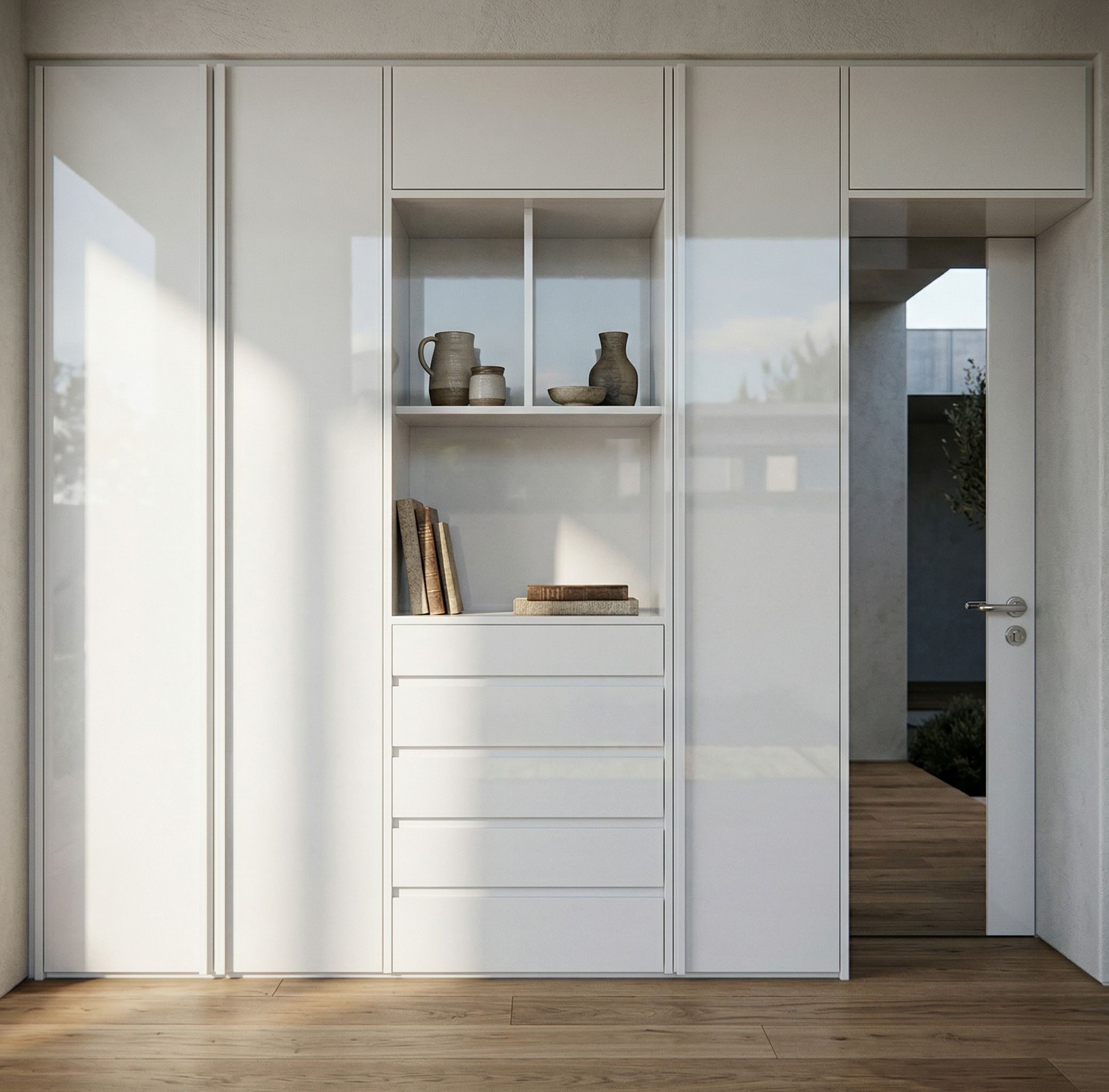 Promptmake this wardrobe a lacquered white finish. the floor should be oak, keep exact camera angle