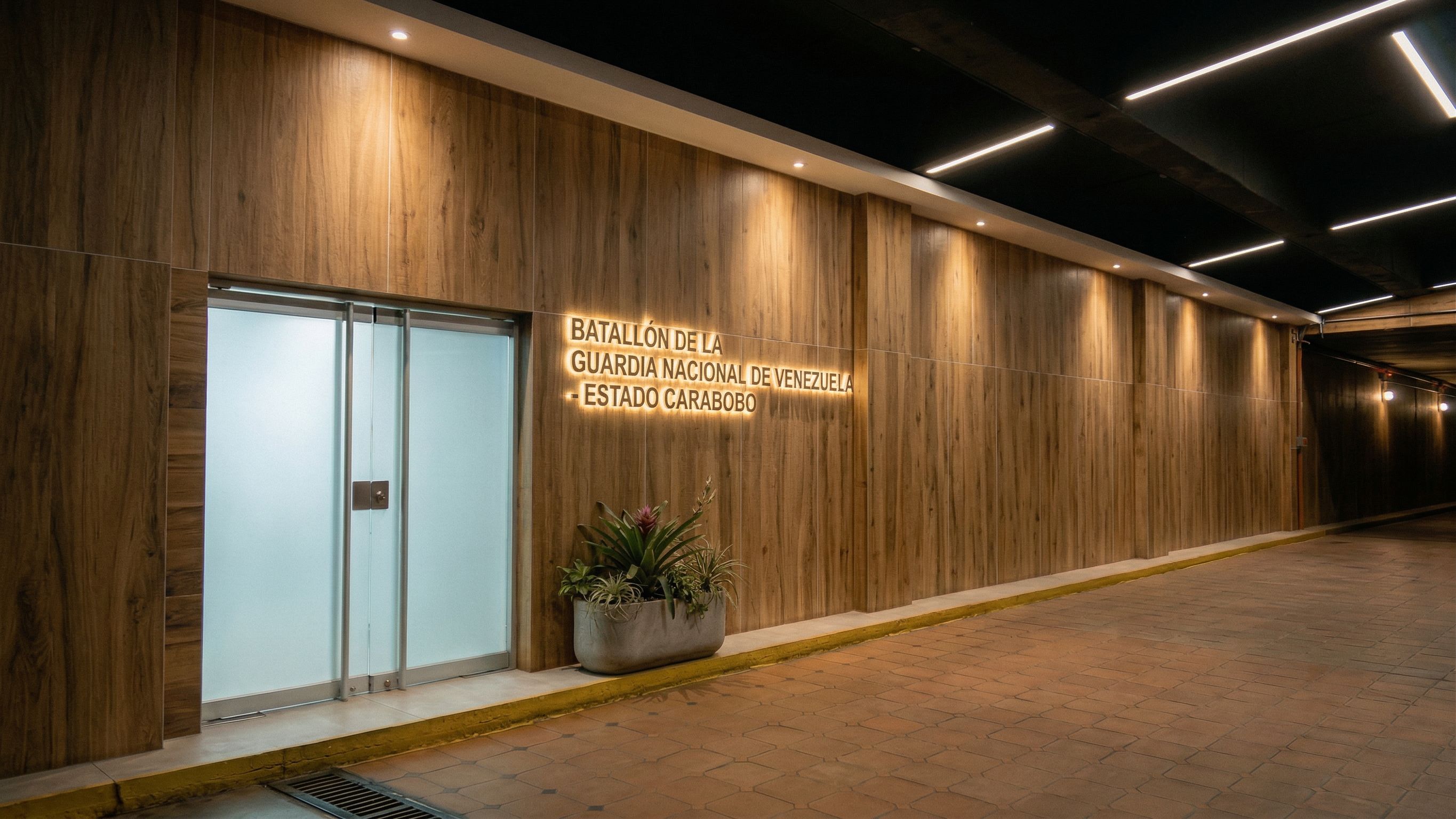 PromptReviste las columnas con el material porcelanato de madera para darle un poco más de carácter y coloca luz indirecta a las letras , keep exact camera angle