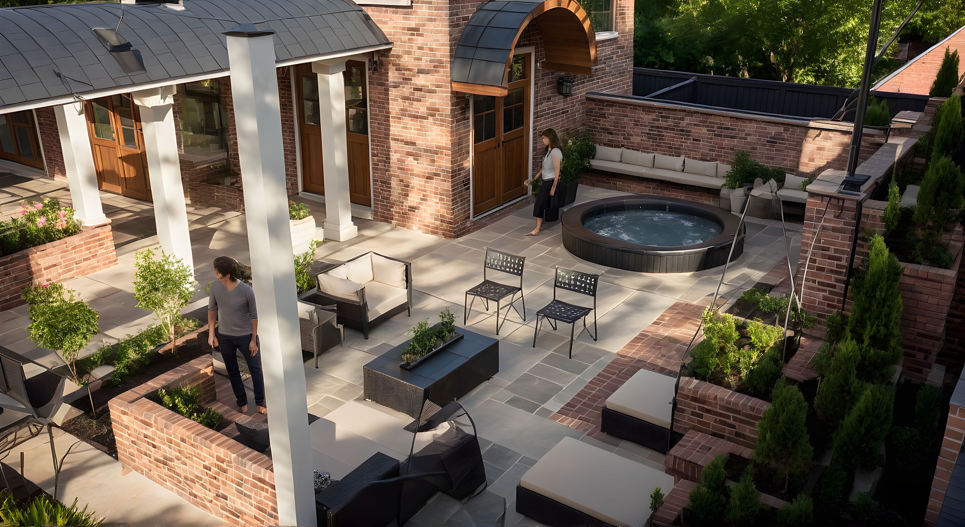 PromptPhoto of a cozy residential courtyard with a brick exterior house as the focal point, showcasing intricate architectural detailing such as arched doorways and elegant wooden doors. The setting includes a well-arranged outdoor lounge area with modern furniture and a circular hot tub, surrounded by manicured greenery and flowering plants. Soft afternoon light casts gentle shadows, enhancing textures. Captured from a slightly elevated angle to provide a wide view of the space, using a standard lens to retain realistic proportions, emphasizing an inviting, lived-in atmosphere. Roof should be green shingles