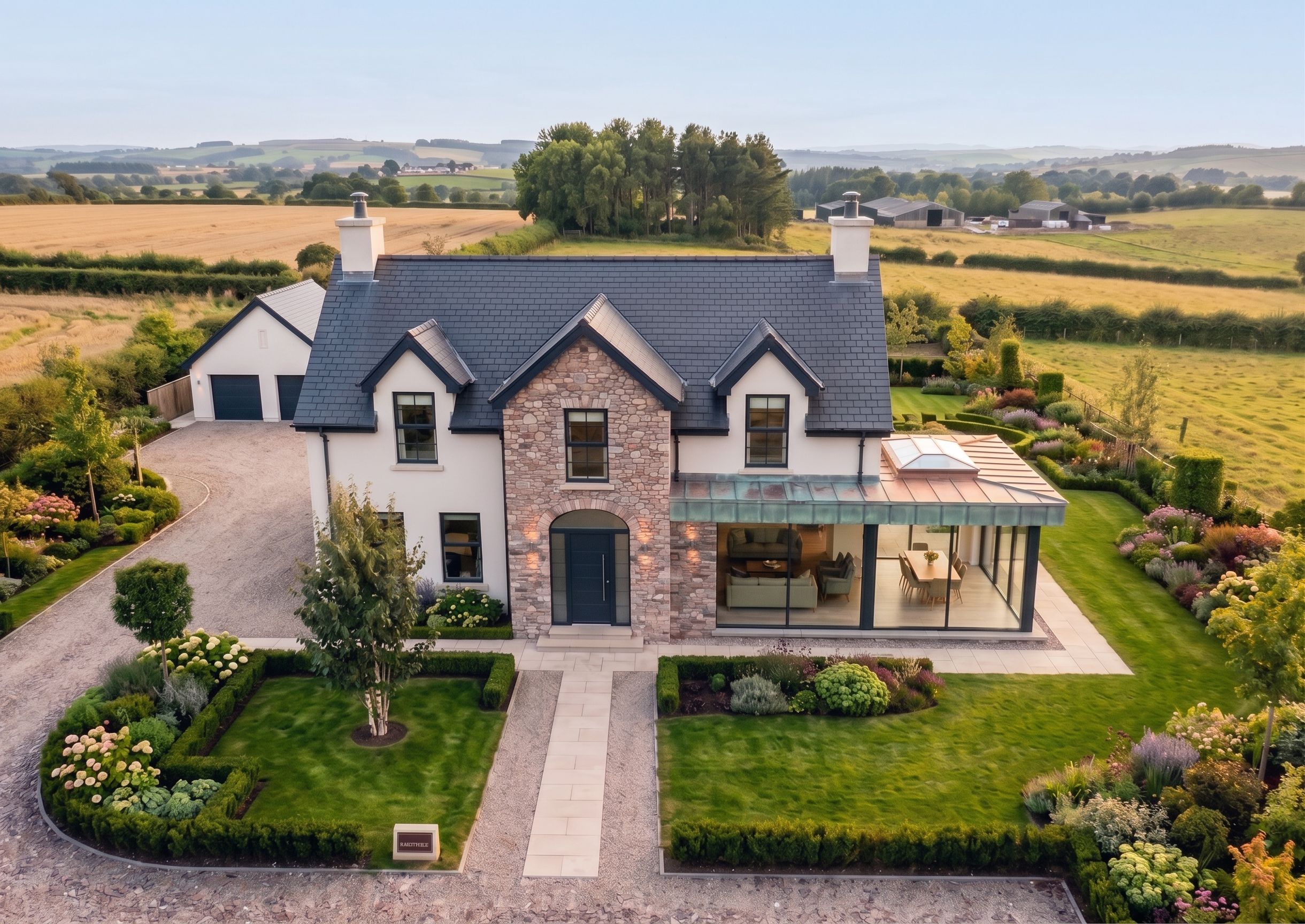 Promptcan you add a double garage behind the house and to the left with a driveway up to it, the garage will white smooth plaster the same as the house.