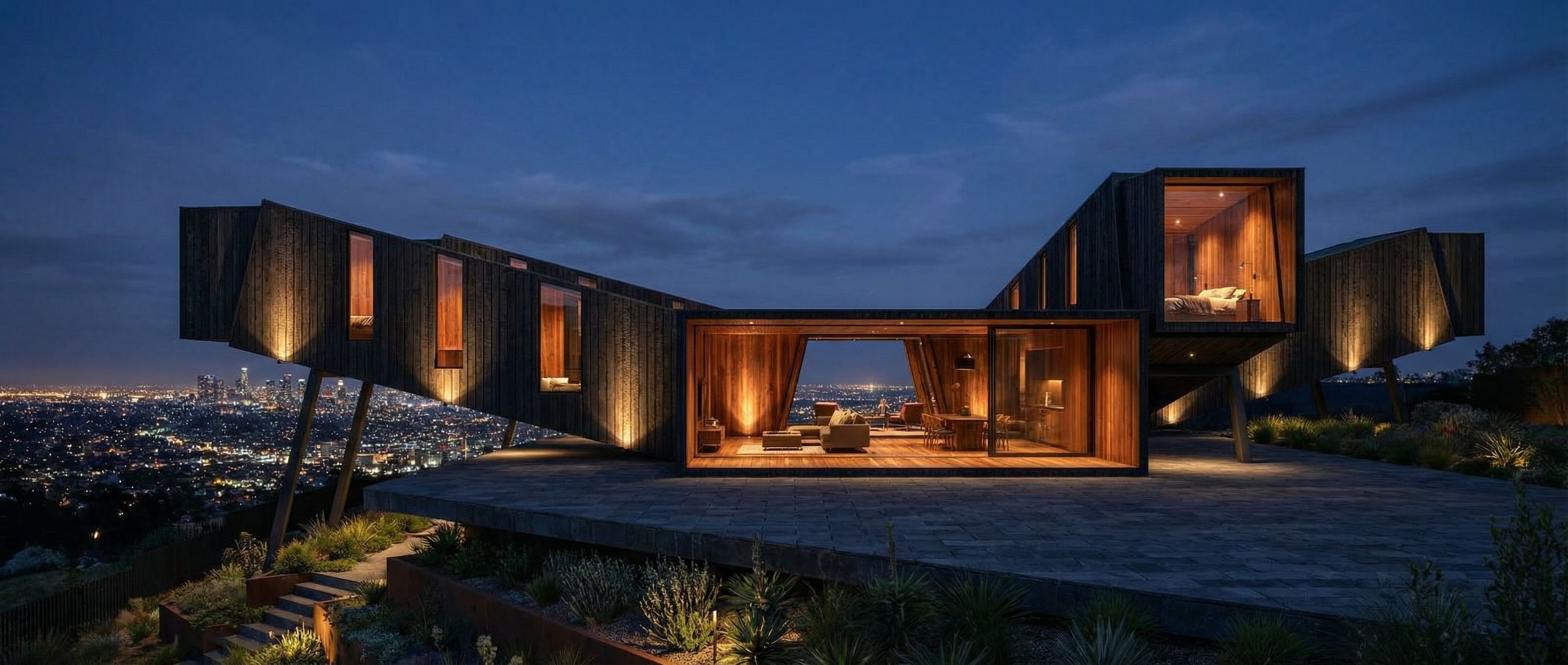 architectural exterior rendering, render this photo into photorealistic rendering, very exclusive house in city landscape.,on a hill. the whole facade in black inside is wood. , keep exact camera angle, night scene with ambient lighting, high quality, professional, detailed scene