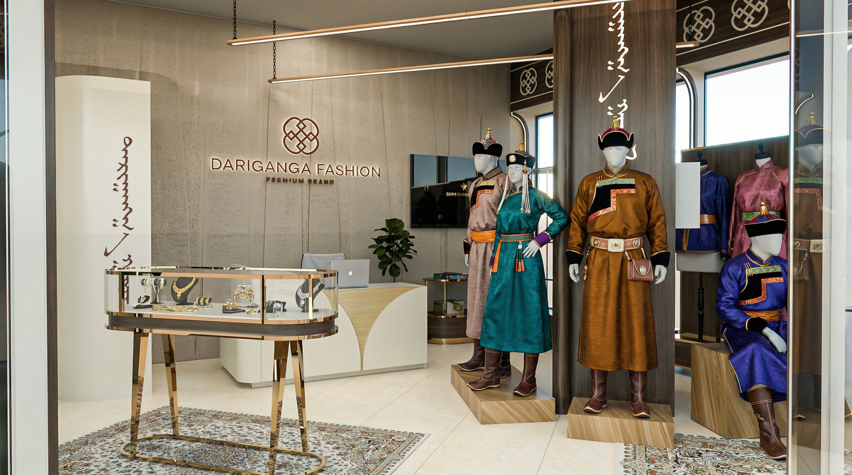 Use the provided image as the base reference. Preserve the **exact camera angle, perspective, room dimensions, furniture positions, mannequin positions, shelves, and architectural layout** from the sketch. Do NOT move, resize, or redesign any objects. The new image should match the **vibe, lighting, color palette, and photorealistic quality** of the first reference image. Keep the warm boutique-style illumination, subtle soft shadows, and dark gray background consistent with the original mood. Dress the mannequins with authentic traditional Mongolian Khalkha and Dariganga clothing, including silk deels, traditional belts, hats, boots, and small accessories. Ensure the clothing is elegant, detailed, and photorealistic. Inside the circular glass display counter, place luxury decorative items such as jewelry, ornaments, and other premium fashion accessories. The items should look realistic and refined, highlighting the high-end showroom atmosphere. The long wall with the light beige tension-mounted silk panel featuring minimal Mongolian patterns should remain visible and unchanged, seen from the same angle as in the sketch. The silk should retain its smooth, glossy appearance. Maintain ultra realistic architectural visualization: physically based materials PBR, global illumination, ray-traced reflections, soft ambient occlusion, cinematic lighting, HDR rendering, extremely detailed textures, and 8k photorealistic quality. Only enhance realism, add traditional clothing to mannequins, add subtle accessories, and decorate the circular glass display with luxury items. Do NOT change the layout, move furniture, or alter architectural elements.