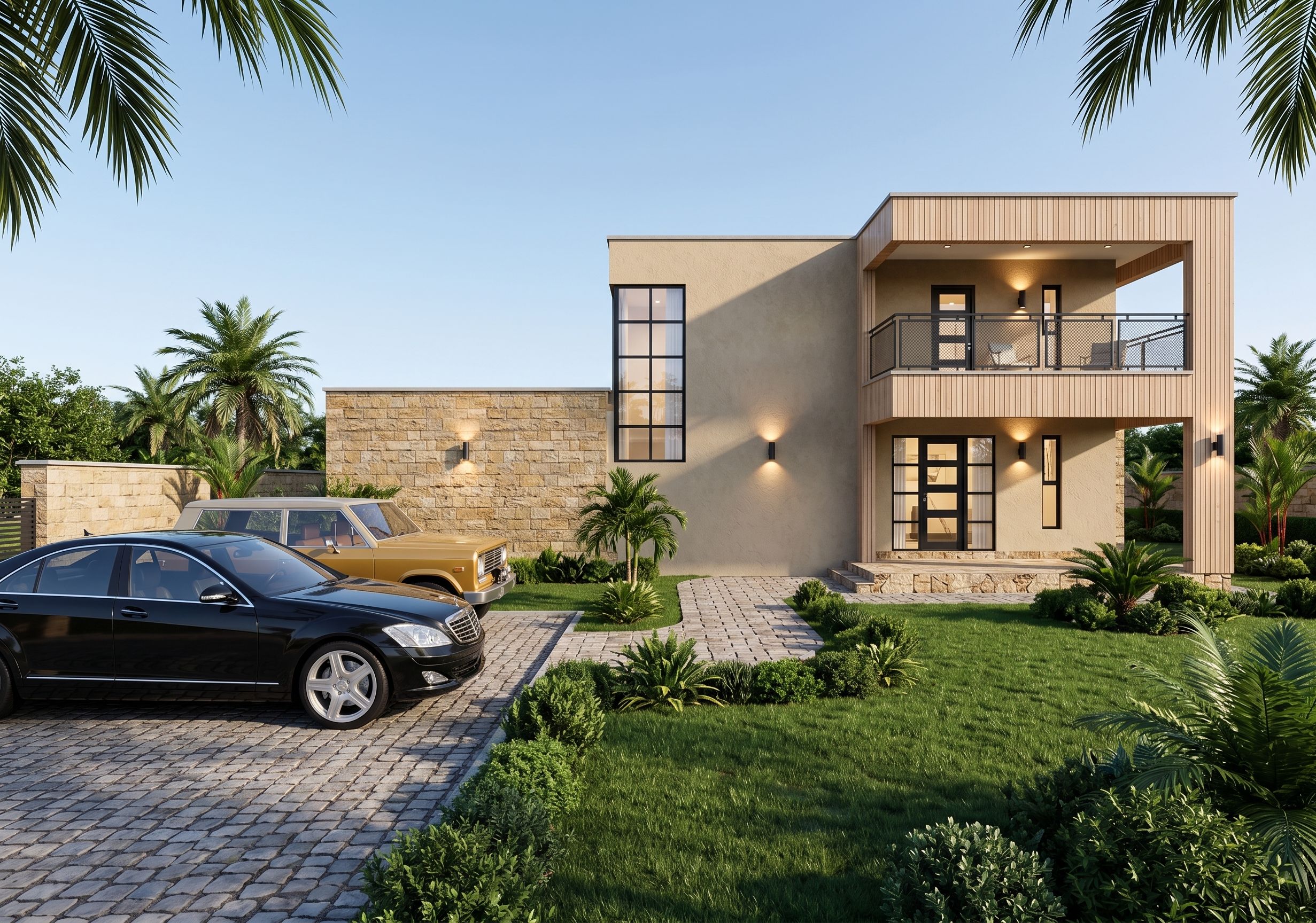 PromptCreate a daytime, ultra-photorealistic exterior architectural render based on the attached reference image, viewed from an eye-level street perspective with a subtle wide-angle lens. The design is a contemporary two-storey residence with textured warm beige plaster walls, light natural timber vertical cladding, and warm-toned stone cladding at the lower level. Black aluminium framed windows and doors with clear glass define the openings, while a flat-roofed upper level features a balcony with black metal and mesh railing. The cobble stone paved driveway appears clean and slightly weathered, leading to natural stone entrance steps. Two luxury cars are parked at the parking. Natural daylight fills the scene under a clear sky, with realistic sun direction casting soft, accurate shadows across walls, paving, and landscaping. Exterior wall lights and balcony soffit downlights are switched on, emitting a warm glow that contrasts subtly with the daylight, while interior lighting is faintly visible through the glazing for depth. Enhance the landscaping with lush green bushes and low shrubs placed around the footprint, complemented by neatly maintained lawn areas and a few taller ornamental plants near boundary walls. Vegetation should feel tropical, balanced, and well-scaled, with gentle leaf shadows adding realism. All materials should display high-resolution textures and subtle imperfections, with realistic glass reflections and accurate global illumination. The overall mood is calm, refined, and premium, suitable for high-end residential marketing, with no people visible and a clean, magazine-quality finish. Turn on interior lights and the two-way exterior wall lights. Keep the exact camera angle., keep exact camera angle