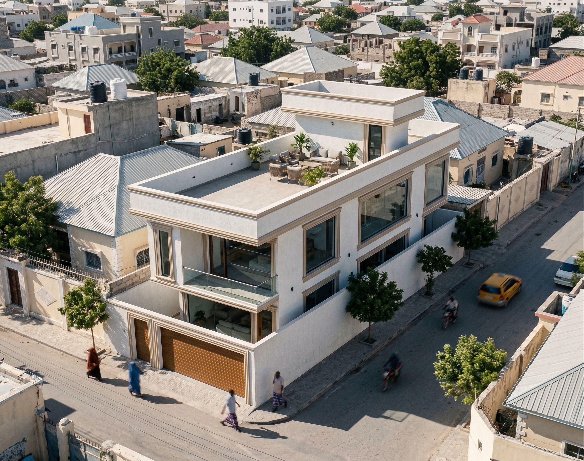 AERIAL VIEW OF A HOUSE , A MASSIONNETTE. INCLUDE MOULDINGS IN WINDOWS AND OPENINGS. USE BAIGE AND DARKER SHADES OF BEIGE IN THE MOULDINGS. MAKE THE GLASS CLEAR, REALISTIC AND TRANSPARENT., keep exact camera angle. REMOVE THE GARDENING ON EITHER SIDE OF THE HOUSE. INCLUDE SOME SITTING SPACE ON THE ROOF. INCLUDE PEOPLE OF SOMALI ORIGIN IN THE IMAGE. BUILDING IN ARESIDENTIAL AREA IN MOGADISHU. MAKE THE BALCONY ON FIRST FLOOR GLASS., keep exact camera angle