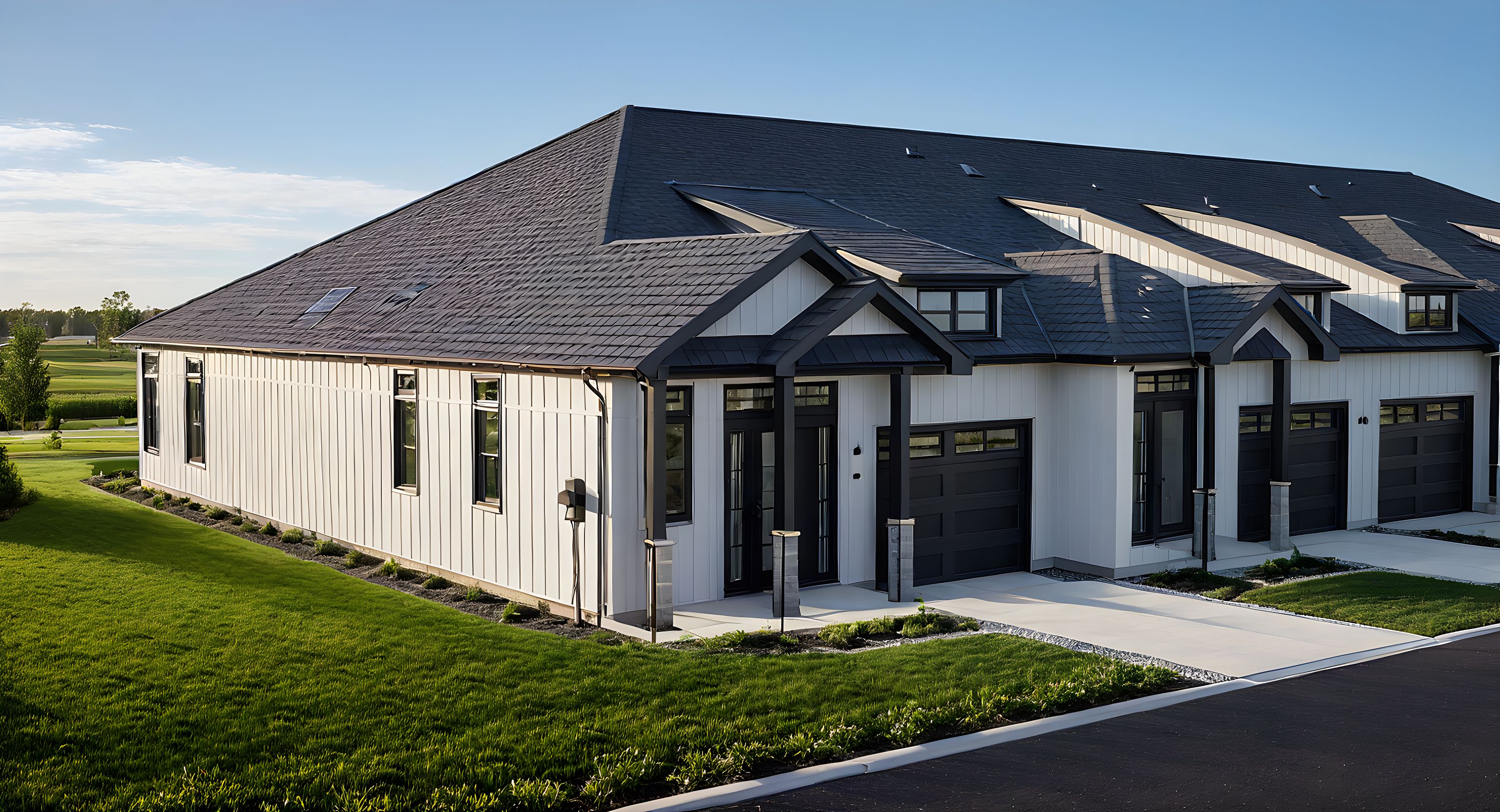 PromptModern residential townhouses Highlight the textured siding, large windows with elegant trim, and distinctive peaked roofs. Set against a suburban landscape, with manicured lawns and paved pathways. Bright, natural lighting. Day time photo realistic wide lens camera, bright blue skies,