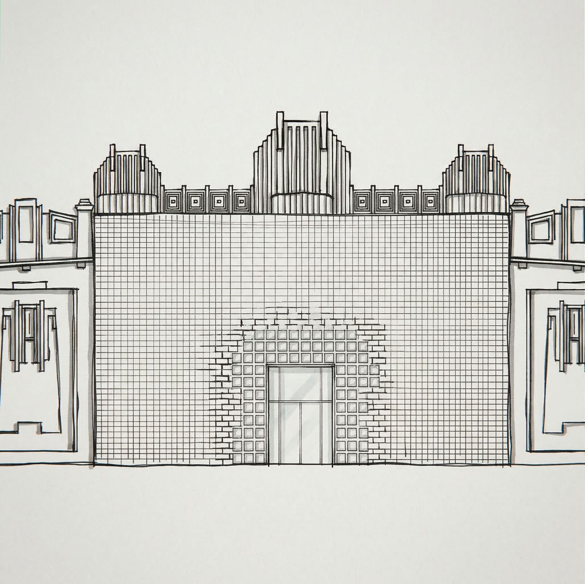 PromptModify this architectural elevation drawing. Apply changes ONLY inside the area marked by red lines. Do not modify anything outside this zone. Intervention (entrance only) Create a small central entrance using glass bricks (Crystal Houses concept). Keep the rest of the façade pure brick. The glass bricks must follow the same brick module and rhythm as the original façade. Around the entrance, create a subtle transition where solid brick gradually blends into glass bricks. The transition should be local and controlled, not spreading across the whole façade. In the very center, use more transparent glass to form the entrance opening. Composition Maintain symmetry and proportions of the façade. The intervention must remain modest in size. The façade should read as mostly unchanged, with only a soft “melting” effect at the entrance. Style black marker architectural sketch (felt-tip pen) loose hand drawing simple bold lines minimal shading no rendering, no photorealism Important modify only within the red-marked area keep everything else unchanged no text no labels no annotations....rough architectural marker sketch, quick concept drawing, black ink only, keep exact camera angle