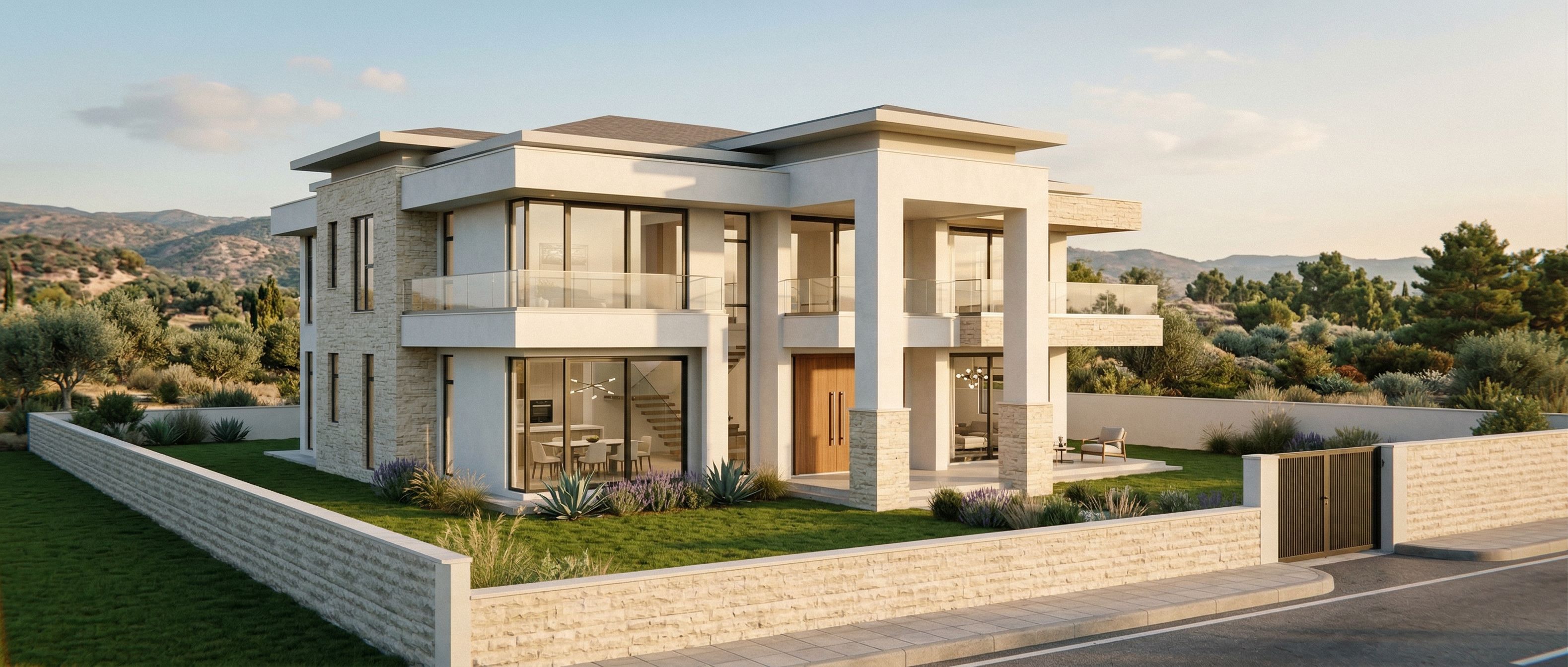 PromptPhoto of a modern residential building featuring expansive glass walls and elegant stone detailing. The design incorporates sleek columns and a prominent roofline. Surrounding the structure is a lush green lawn. The scene is illuminated by soft afternoon sunlight, casting gentle shadows across the facade. A low-angle perspective highlights the building's striking features, while a wide-angle view captures the impressive scale and surrounding environment, emphasizing the harmonious balance between nature and architecture. Remove the chamfer and other houses , keep exact camera angle