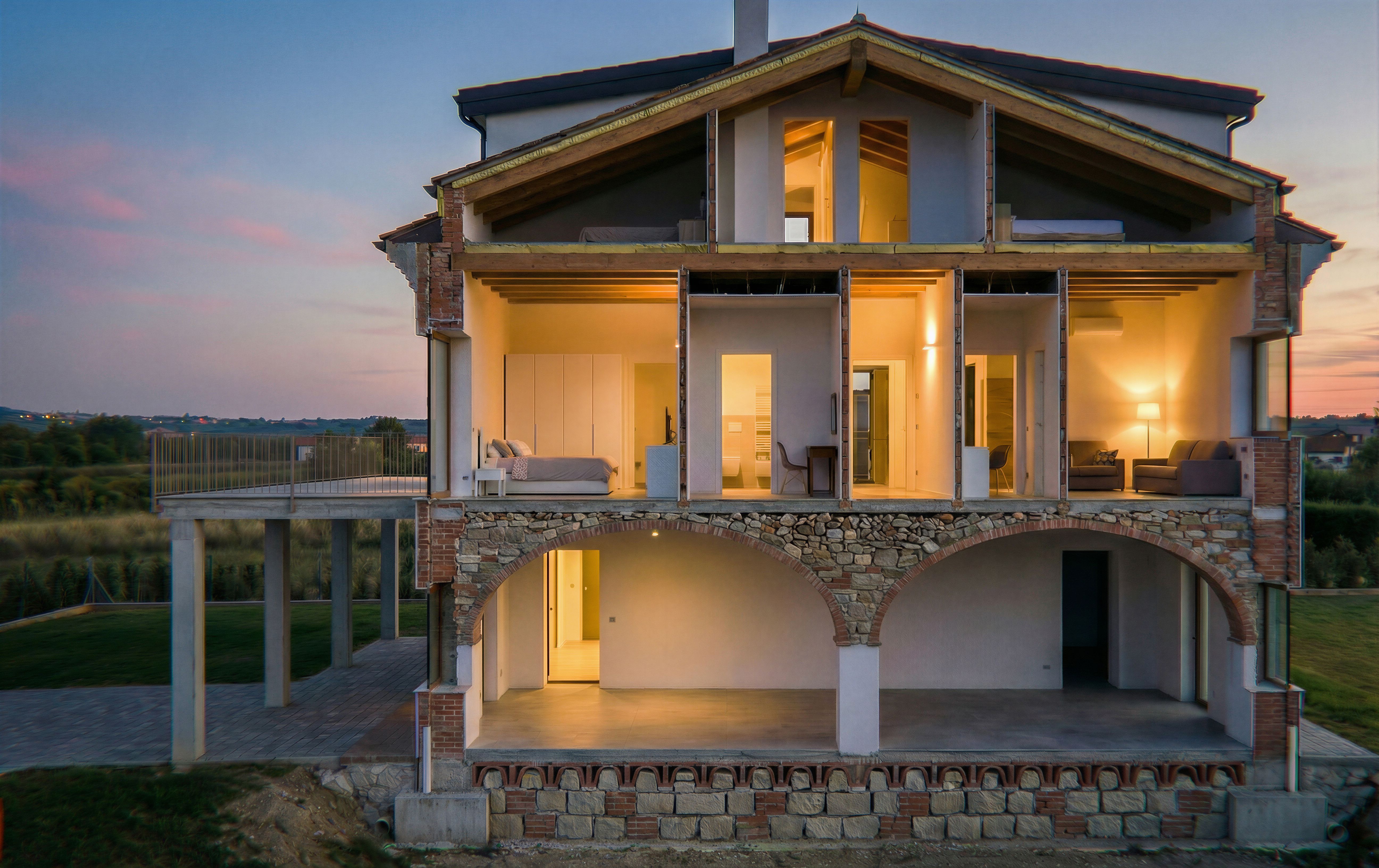 Place a thin layer of concrete under the ground floor of the igloos, and under the thin layer of concrete, place foundation stones. Replace the concrete foundations of the house with foundations of large square stones mixed with bricks. Add a sectioned terrace on the left of the house on the first floor, at the same level as the first floor, with concrete columns supporting it from below, as shown in the reference section. , keep exact camera angle