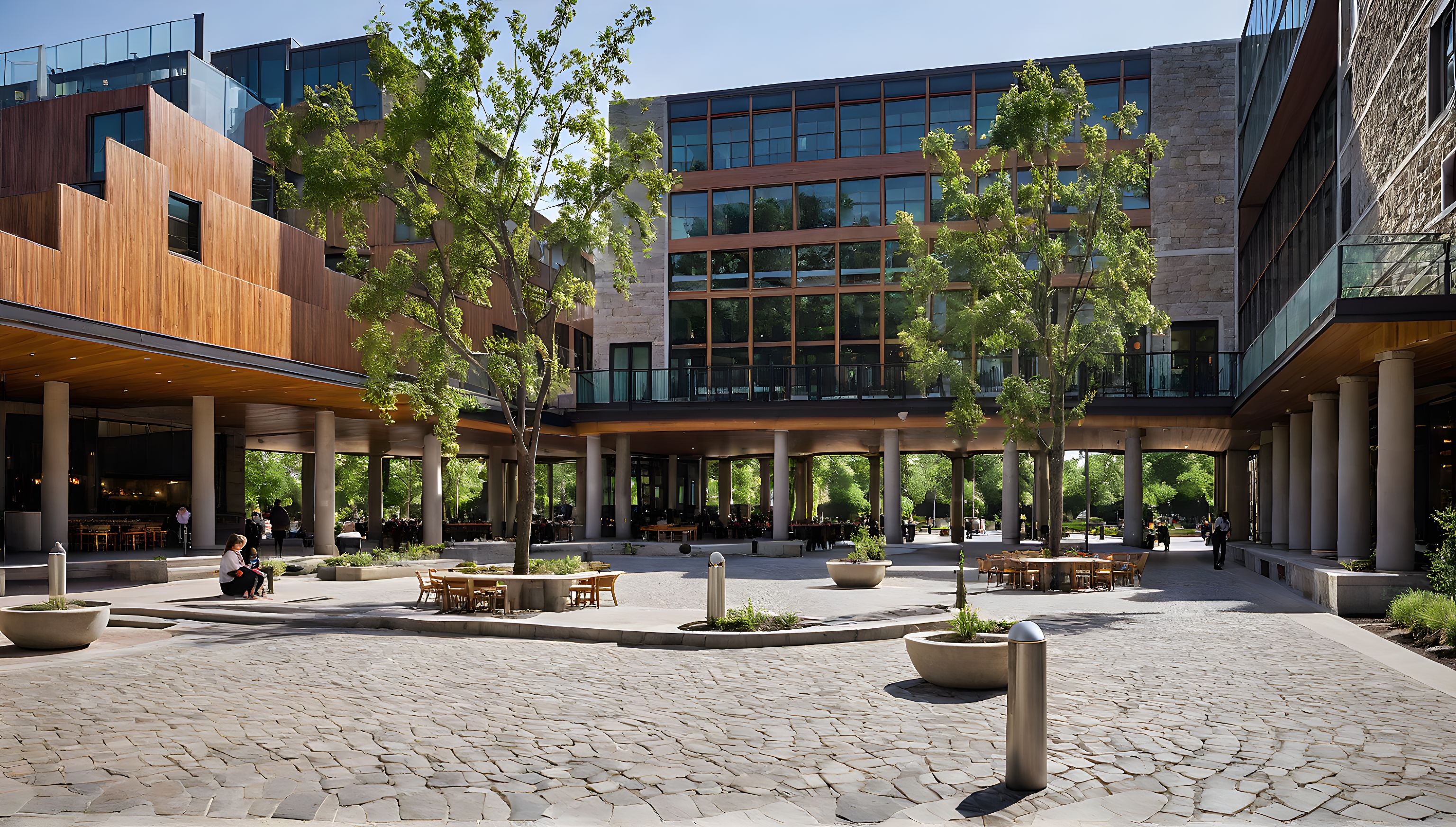 PromptPhoto of a CLASSIC BUT CONTEMPORARY mixed-use building featuring a blend of wood and concrete materials with expansive glass facades. Architectural details include overhangs, exposed columns, and a spacious, open courtyard surrounded by greenery. Urban setting with nearby structures and public seating areas, fostering community interaction. Bright, natural daylight creates soft shadows, highlighting textures of both the building and the stone paving. Perspective from a low angle to emphasize height and grandeur, using a wide-angle lens to capture the entirety of the environment and surrounding activity. THE GROUND FLOOR IS OPEN AND IT HAS ROUND FOOD ISLES WITH TABLES. THE GROUND FLOOR COLUMNS HAVE CONCRETE ARCHES, AND THE HANDRAILS ARE CLASSICAL