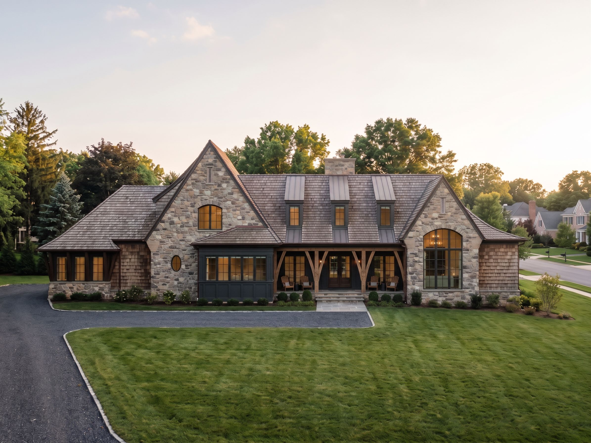 PromptMake these changes. Stone under porch. Match side dormer finish to front dormer finish. Elongate porch brackets. Slanted angle brackets. , keep exact camera angle