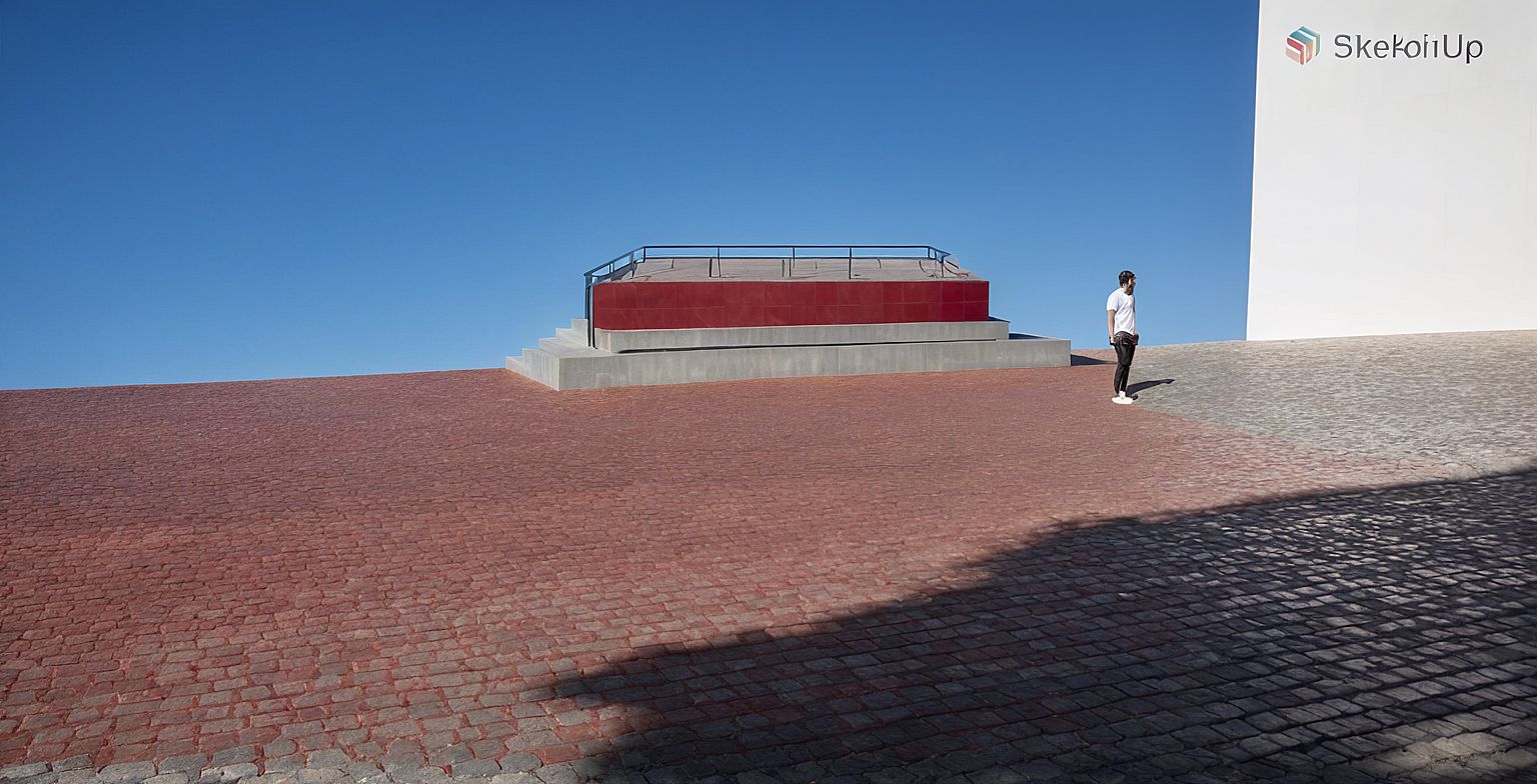 PromptPhoto of a modern architectural platform with tiered levels, featuring a mix of smooth concrete (grey areas in the photo) and the wall made of big, rough, red sandstone chunks (red areas in the photo). The surrounding cobblestone pavement adds an earthy touch, complementing the sleek design. Captured during the day with warm sunlight casting gentle shadows, highlighting the textures. A low-angle perspective frames the scene, emphasizing the scale of the structure against a clear sky while capturing the figures engaged in conversation. Black Steel railing on top of platform