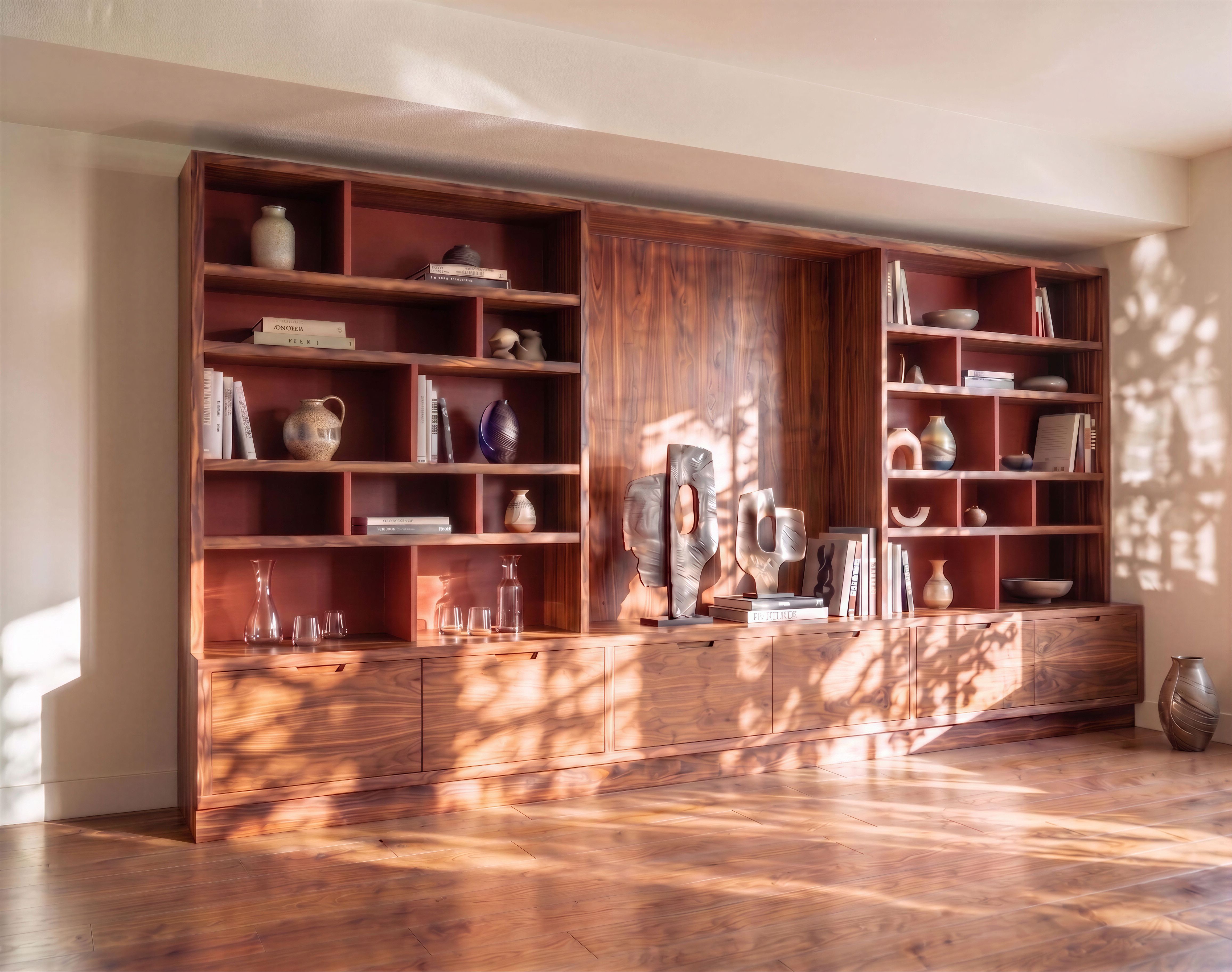 change painted drawers to walnut change vertical dividers in shelves to tuscan red no.140 , keep exact camera angle