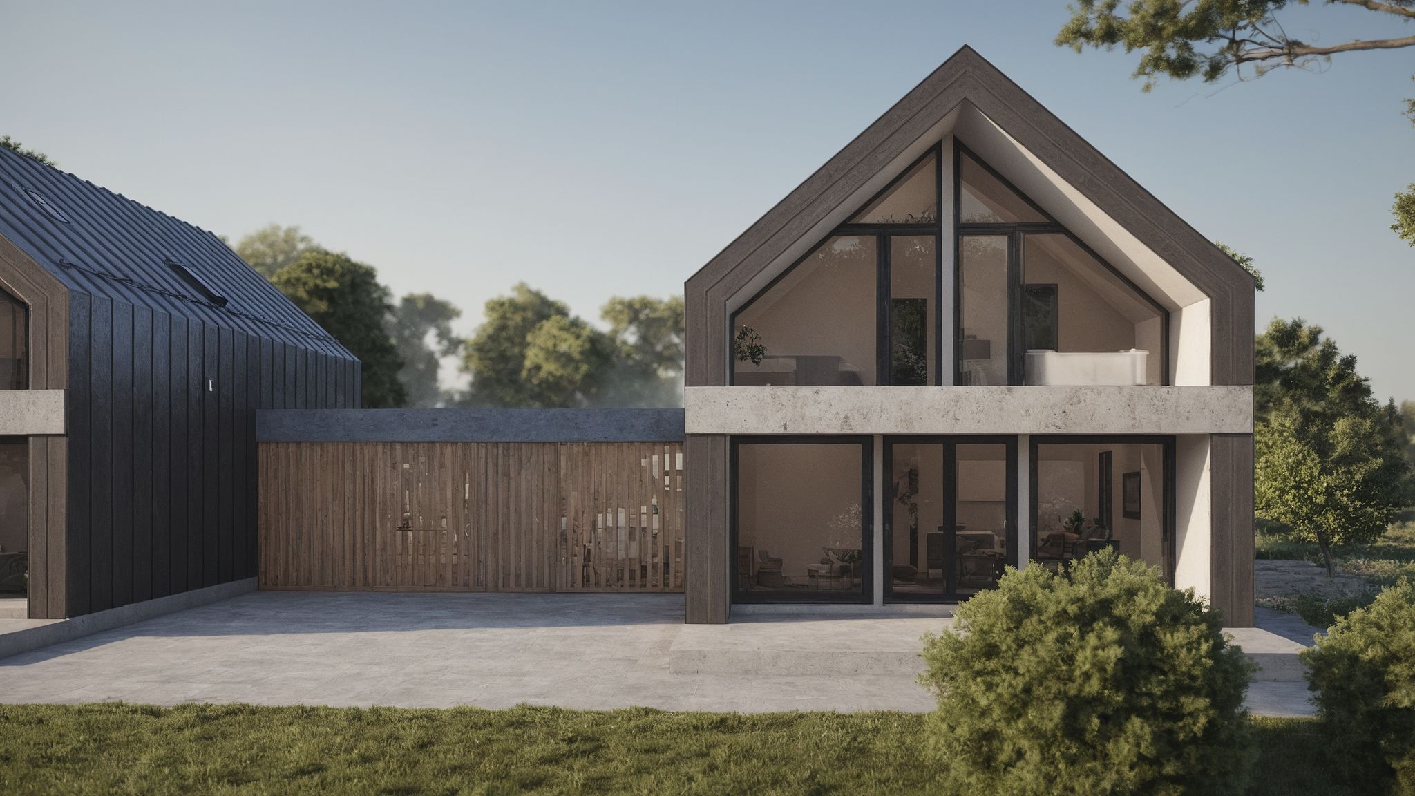 Enhance the realism of this building render. Keep all geometry, proportions, and material types exactly the same — do not alter the architecture. Increase the photorealism of plants, lighting, shadows, and surface textures. Refine reflections, ambient light, and materials so they look more natural and detailed. Preserve the bicycle in the scene exactly as it appears — do not modify, deform, or redraw it in any way; keep its geometry, proportions, wheels, spokes, and placement pixel-accurate. Use inpainting or local adjustments only outside the bicycle area. Keep colors vivid and balanced — avoid dull, gray, or blurry appearance. Maintain a crisp, high-quality, realistic look with natural contrast and lighting.
