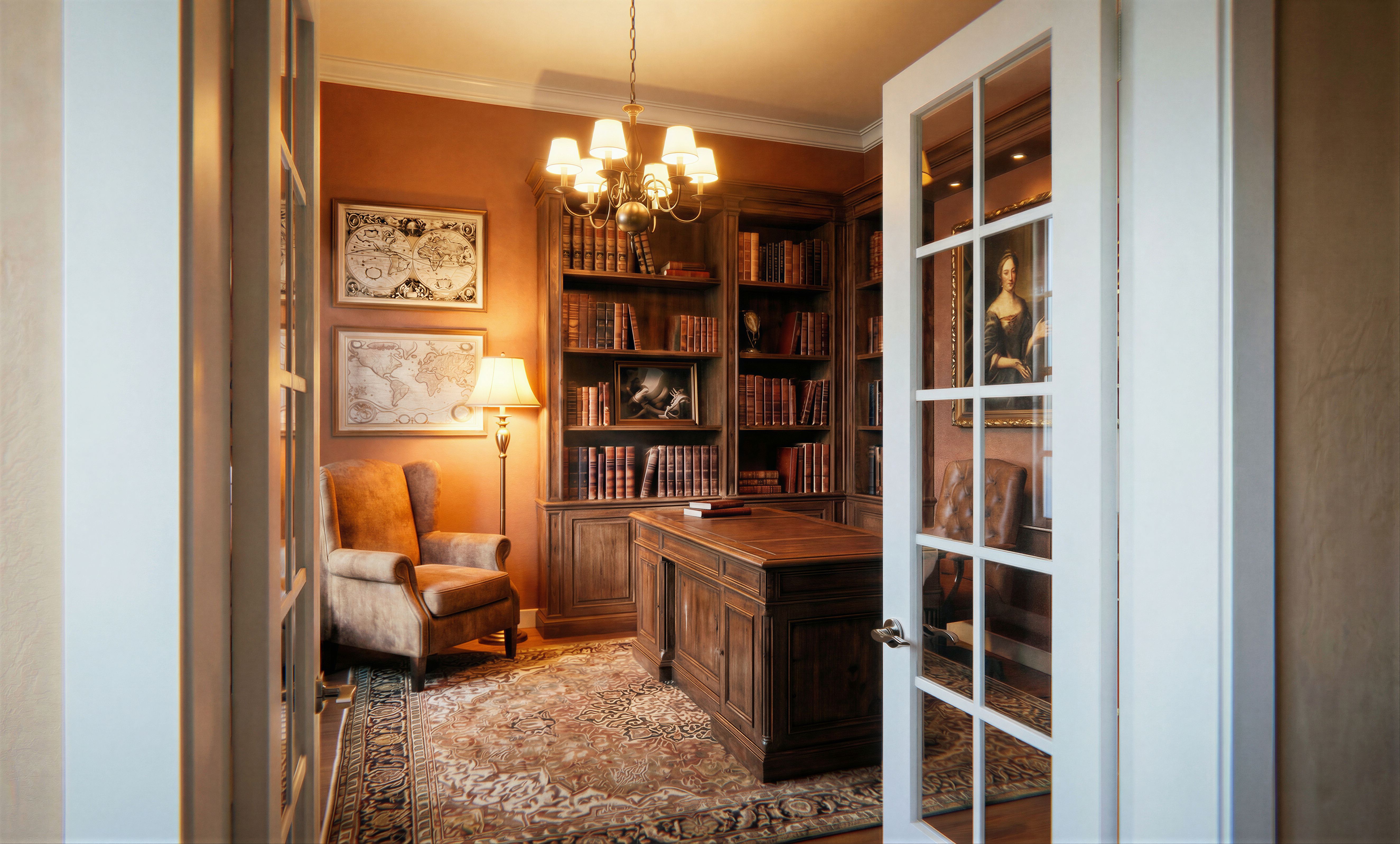 PromptMake Italian style home office per Uploaded Image, add floor lamp the sofa chair and bookcase, French door is white, keep exact camera angle