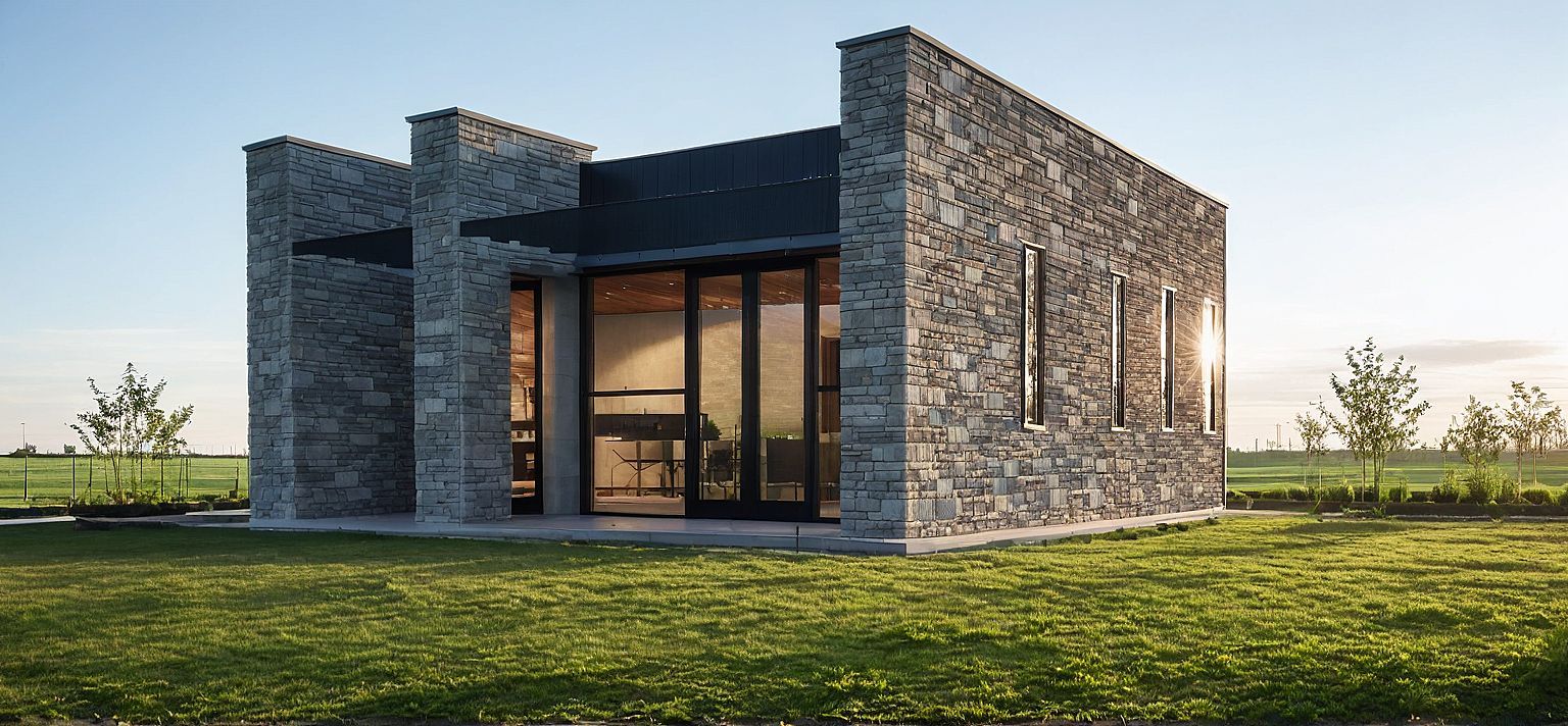 PromptPhoto of a modern single-story residential building featuring a combination of stone and smooth wall textured exterior paint. The open facade showcases large glass sliding doors and narrow vertical windows, emphasizing transparency and connection with the garden. Surrounded by a lush green lawn, the structure is illuminated by natural daylight, creating soft shadows on the surface. Captured from a low angle, the perspective enhances the building's height, featuring a wide frame that includes the foreground grass and hints of the sky above, evoking a serene outdoor environment.