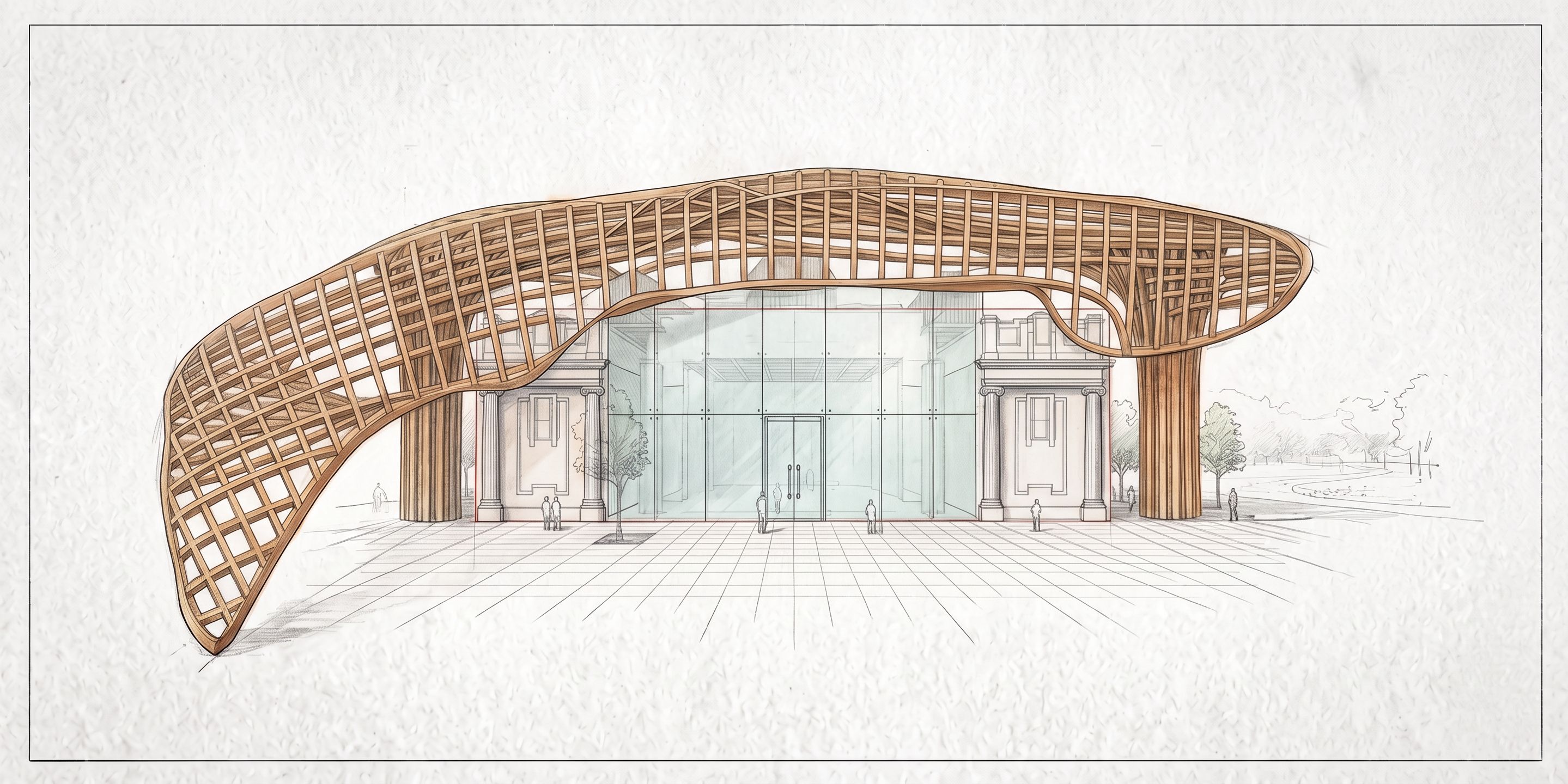 Promptmake the front fasade glass with the glass doors and make the woden roof looks natural with the buliding but dont change shape of anything, follow the shape of the roof and the colums will be nex to the building too, make it just like drawing sketch, but make it more precise, keep exact camera angle