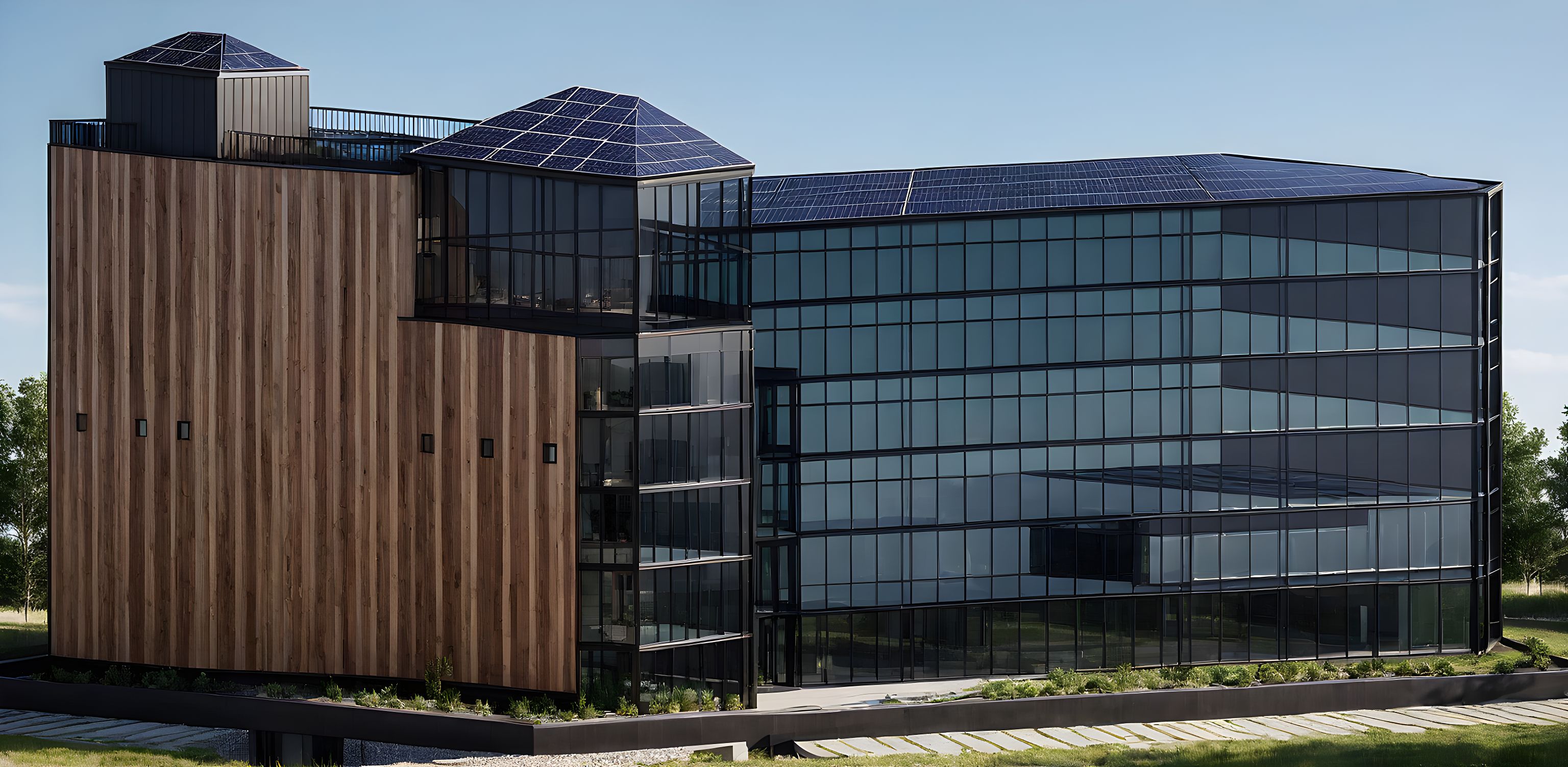 Promptadd stairs, green spaces at the bottom of the building around it. solar pannels at the top of the building. reusable harvestign water system tanks at the top of the building. black colour wood claddign on the left side of the budiling wall. more realistic with reflective glass panels