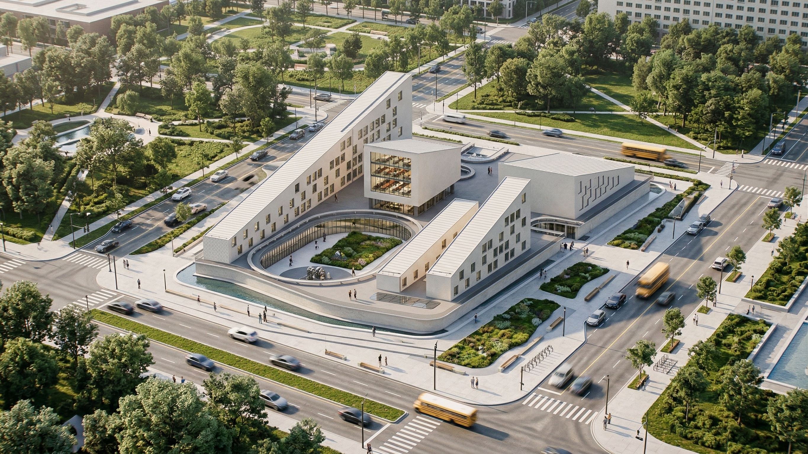 PromptPhoto of a modern multi-story school institutional building with asymmetric geometric design elements, featuring facades, large glass windows, and varied rooflines. Set in a landscaped urban environment, surrounded by manicured greenery and walkways. Warm afternoon sunlight casts dynamic shadows across the structure, enhancing its textures. Captured from a high-angle perspective with a wide-angle lens, focusing on the unique architectural details and the integration of the landscape into the overall design. you can render and change the materials, the colors, and the design and enhance it ..., keep exact camera angle