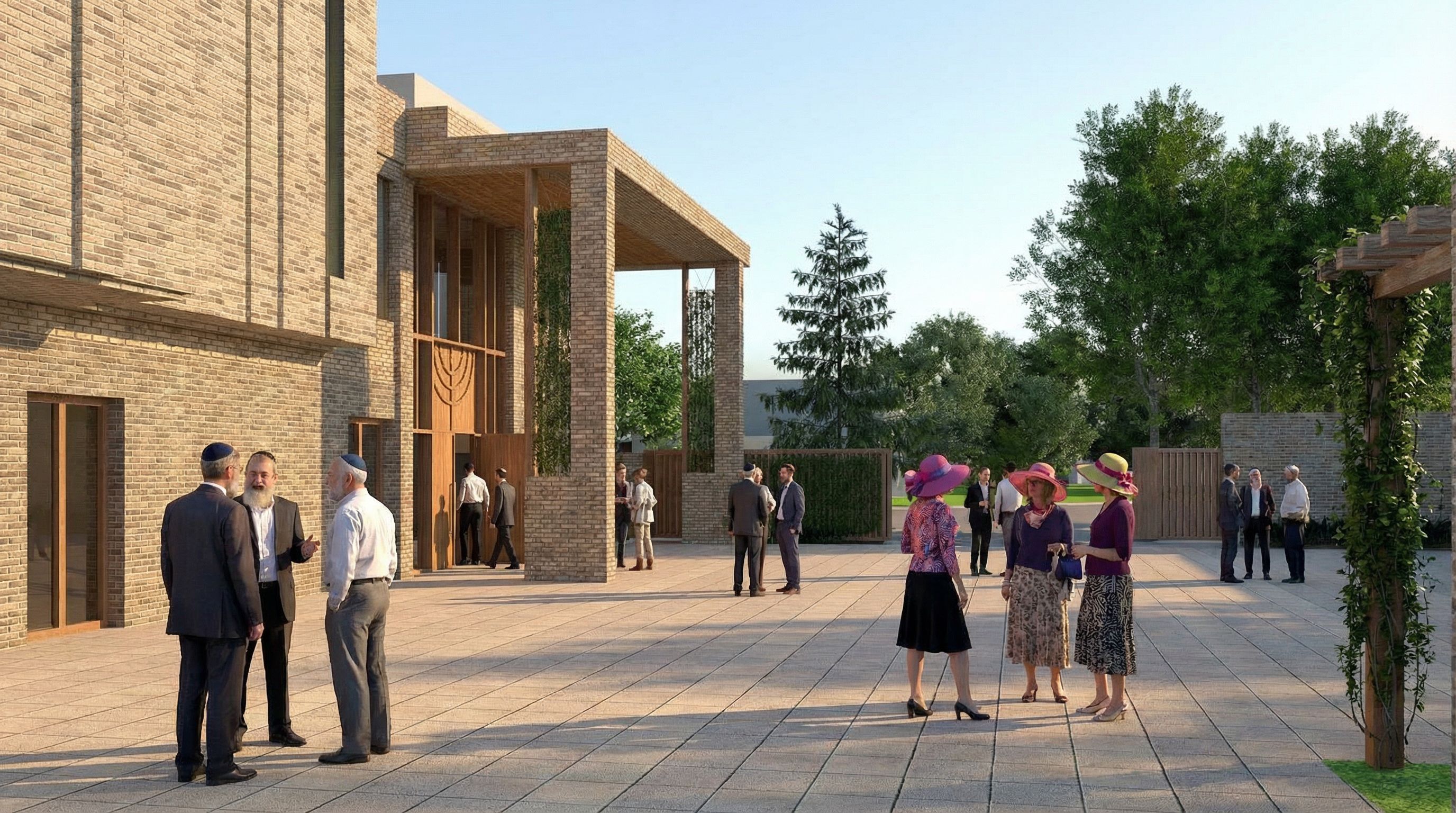 architectural exterior rendering, render this 3D mass into photorealistic rendering, new synagogue, emphasize brick detailling, men with kippa, women with colourful hats, various ages , eye level view, including people, high quality, professional, detailed scene