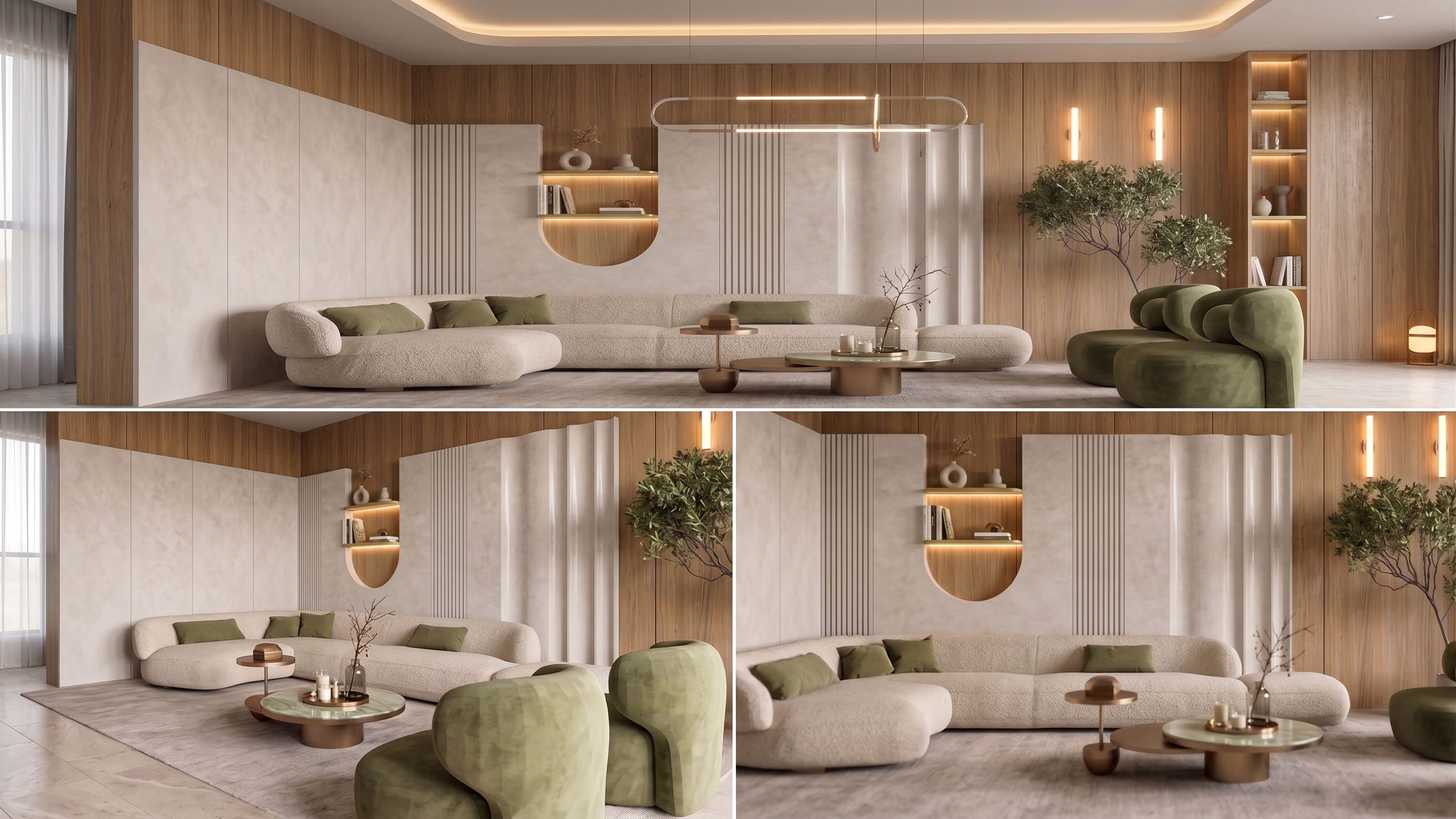 Ultra-realistic modern organic living room interior, soft minimal luxury style, warm neutral palette. Curved modular sofa upholstered in textured bouclé fabric in light beige tone, soft rounded edges, plush cushions. Coffee tables: one circular polished marble top with subtle green veining and brushed brass base, second smaller side table in matte bronze finish. Wall treatment: combination of vertical wooden panels in warm oak veneer, smooth microcement panels in off-white, and sculptural fluted wall details with soft curves. Built-in shelves with indirect warm LED strip lighting, decorated with minimal ceramic vases, small sculptures, and books. Accent chair with organic rounded form, upholstered in muted olive green fabric. Floor finished with large format light beige stone tiles, partially covered with soft textured area rug in neutral tone. Lighting: Soft indirect cove ceiling lighting warm 3000K, hidden LED strips emphasizing ceiling curves. Modern linear pendant lights with thin minimal profiles in matte white and brushed brass, emitting soft diffused light. Wall sconces with vertical glowing tubes, warm ambient light. Natural daylight entering softly from unseen large window, diffused, no harsh shadows. Decor & realism details: Add subtle imperfections: fabric wrinkles, slight wear on edges, natural reflections on marble and metal. Include realistic small decor: glass vases, dried branches, books, tray with candles. Add indoor plant with natural foliage olive tree style. Accurate shadows, global illumination, soft reflections, ambient occlusion. Camera & render: Wide-angle interior shot 24–28mm, eye-level perspective. Photorealistic, high dynamic range, soft contrast, cinematic exposure. Depth of field very subtle. 8K resolution, ultra-detailed textures, physically accurate materials. “same materials, same lighting setup, same color palette, consistent scene, different camera angles only” “top view angle” “close-up on coffee table” “side perspective from chair” “focus on wall details”, keep exact camera angle