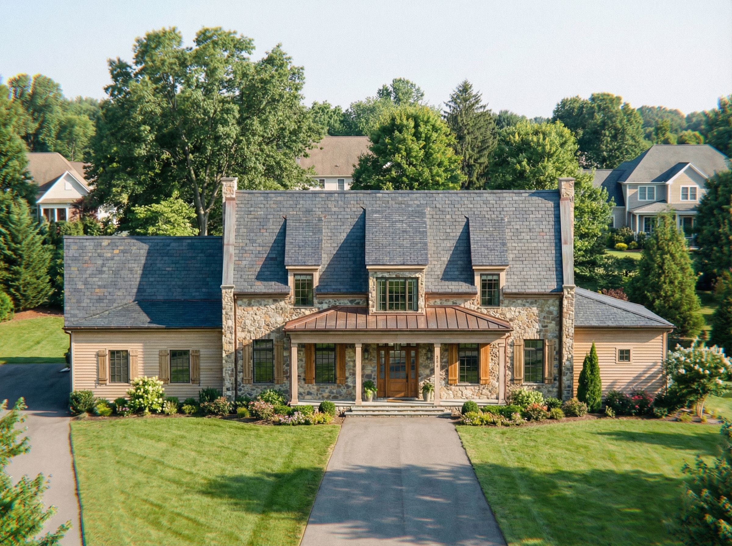 PromptMake front middle roof accents metal. Add copper gutter and downspouts.