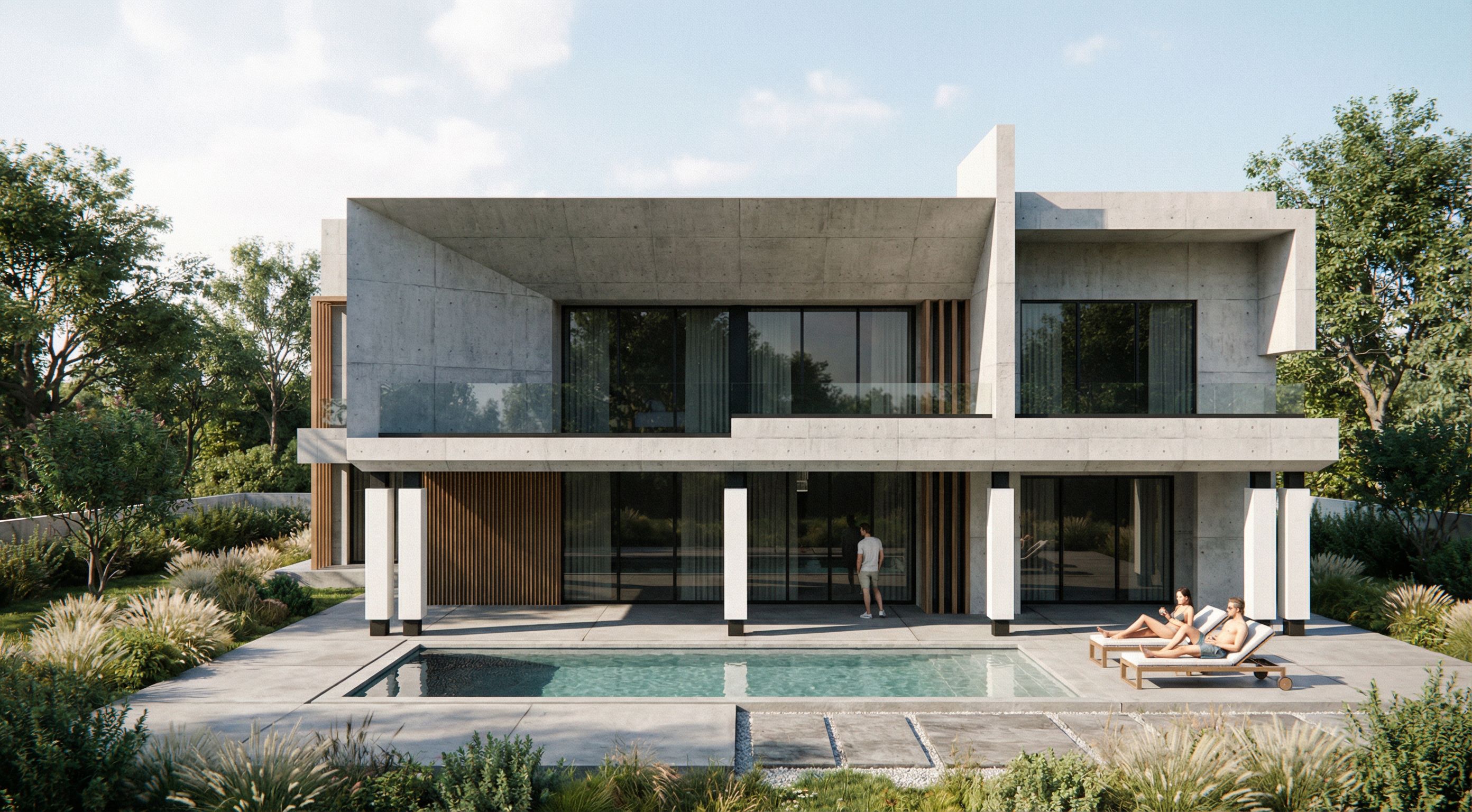 modern minimalist concrete house, rear view of the house, two-story contemporary architecture, exposed concrete facade, large cantilevered roof, floor-to-ceiling slightly tinted dark glass windows, lighter dark tint that still allows visibility, black metal window frames, no curtains, all doors made of glass with black metal frames, transparent glass railings, all structural columns finished with a combination of white and black, dark metal accents and vertical wood slats, modern swimming pool integrated into the backyard, minimalist pool terrace with clean concrete or stone flooring, natural landscaping with ornamental grasses, shrubs and trees surrounding the backyard, calm residential environment, daytime architectural render, bright sky with soft clouds, natural daylight illumination, soft natural shadows, no artificial lighting, architectural photography style, ultra realistic materials, global illumination, ray tracing, highly detailed textures, photorealistic architectural visualization, 8k render, strictly preserve the original architecture of the reference image, maintain the same building shape, proportions and structure, keep exact camera angle