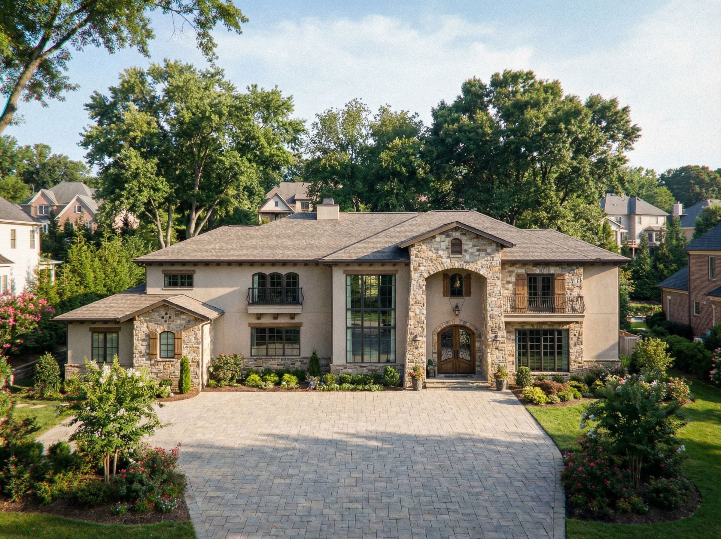 PromptPhoto of a residential building with a blend of traditional and modern design elements, featuring textured stone finishes and extensive window placements. Surrounded by a landscaped garden, the setting offers a quaint suburban neighborhood. Natural daylight casts soft shadows across the facade, highlighting the architectural details. Captured from a frontal angle using a wide-angle lens to emphasize the scale and symmetry, focusing on the ornate entrance and decorative balcony above, creating a welcoming atmosphere., keep exact camera angle