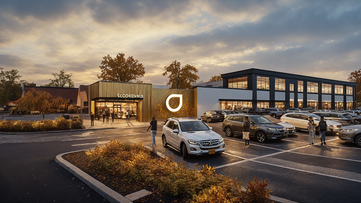 PromptModern retail facade featuring a new metal panel, metal canopy, painted brick, golden color store windows, bright ambiance, asphalt road, captured in the evening sky during the autumn season.