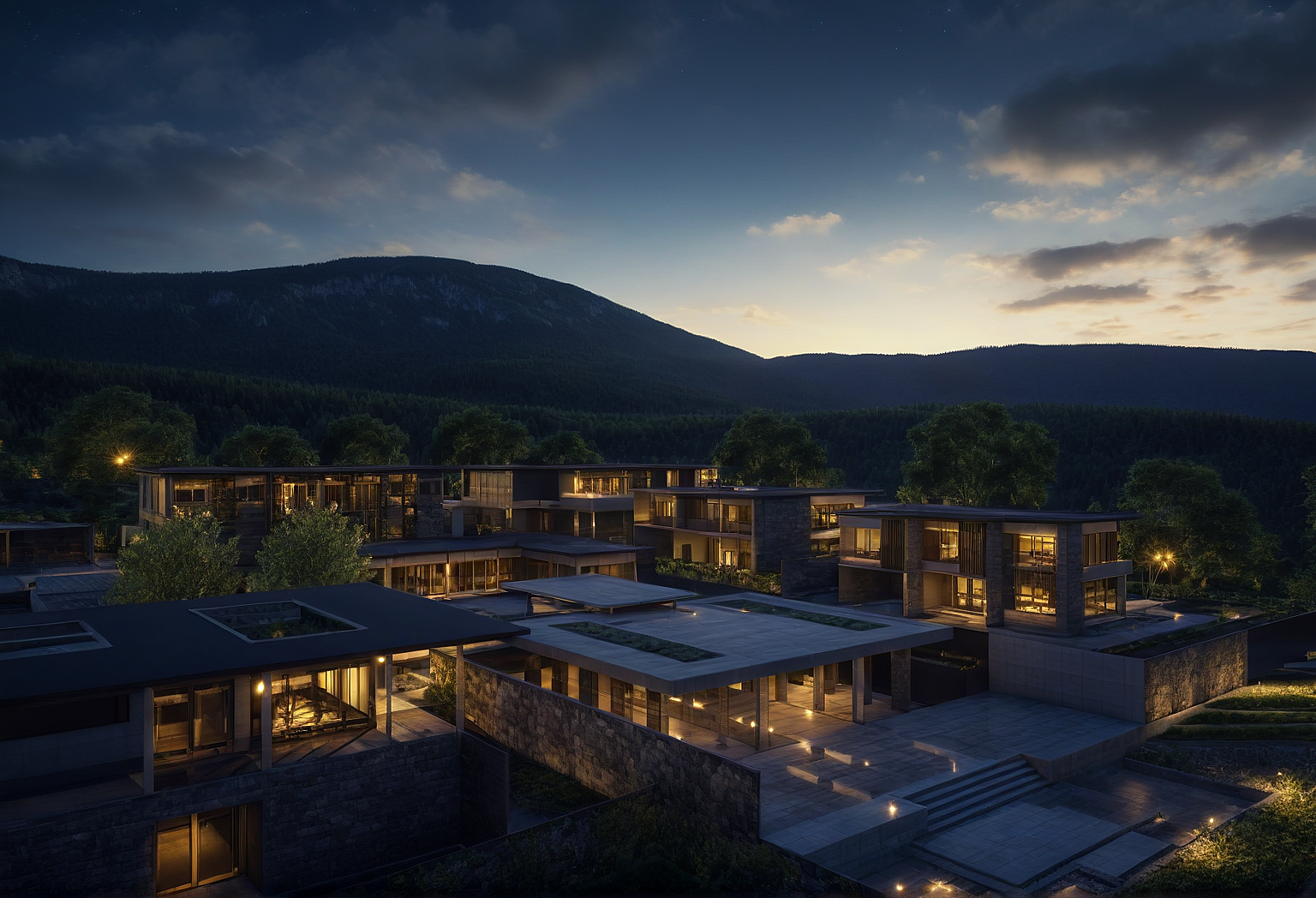 render as a night time sky is very dark but star is all over the sky every window have warm yellow light focus or star sky night and forest mountain background make sky all dark only see star