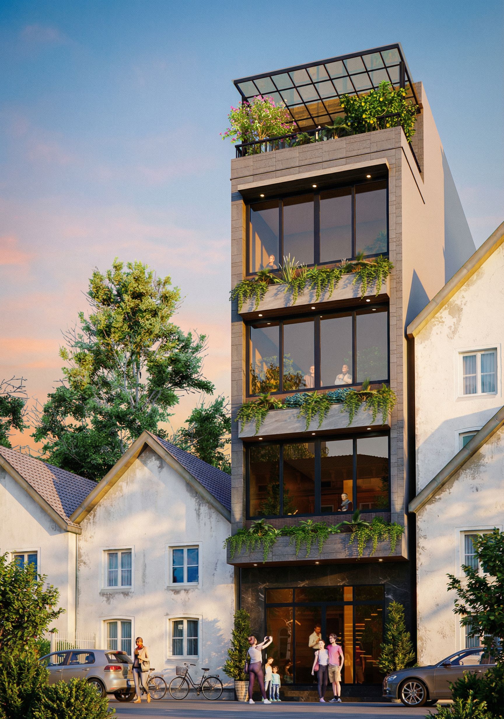 PromptPhoto of a contemporary multi-story residential building, featuring large glass windows, and a rooftop garden. Surrounded by traditional white houses, the urban setting contrasts modernity with classic architecture. Bright natural lighting showcases the clear blue sky, casting soft shadows on the façade. Captured from a low angle to emphasize height and detail, the scene invites viewers to appreciate the blending of nature with modern design, using a wide-angle lens for an immersive perspective. Preserve the original proportions and shapes of the image. Maintain the same camera angle. Describe the materials based on the materials in the image in a clearer, more realistic way, with a more lifelike effect and depth of texture. The lighting is soft and surreal., keep exact camera angle