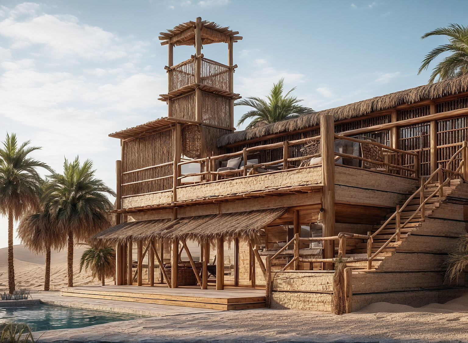 Promptits a hotel villa in a desert the exterior is made up of wooden straws and thatched roof and there is a pool on the villa terrace and loungers boho downstairs