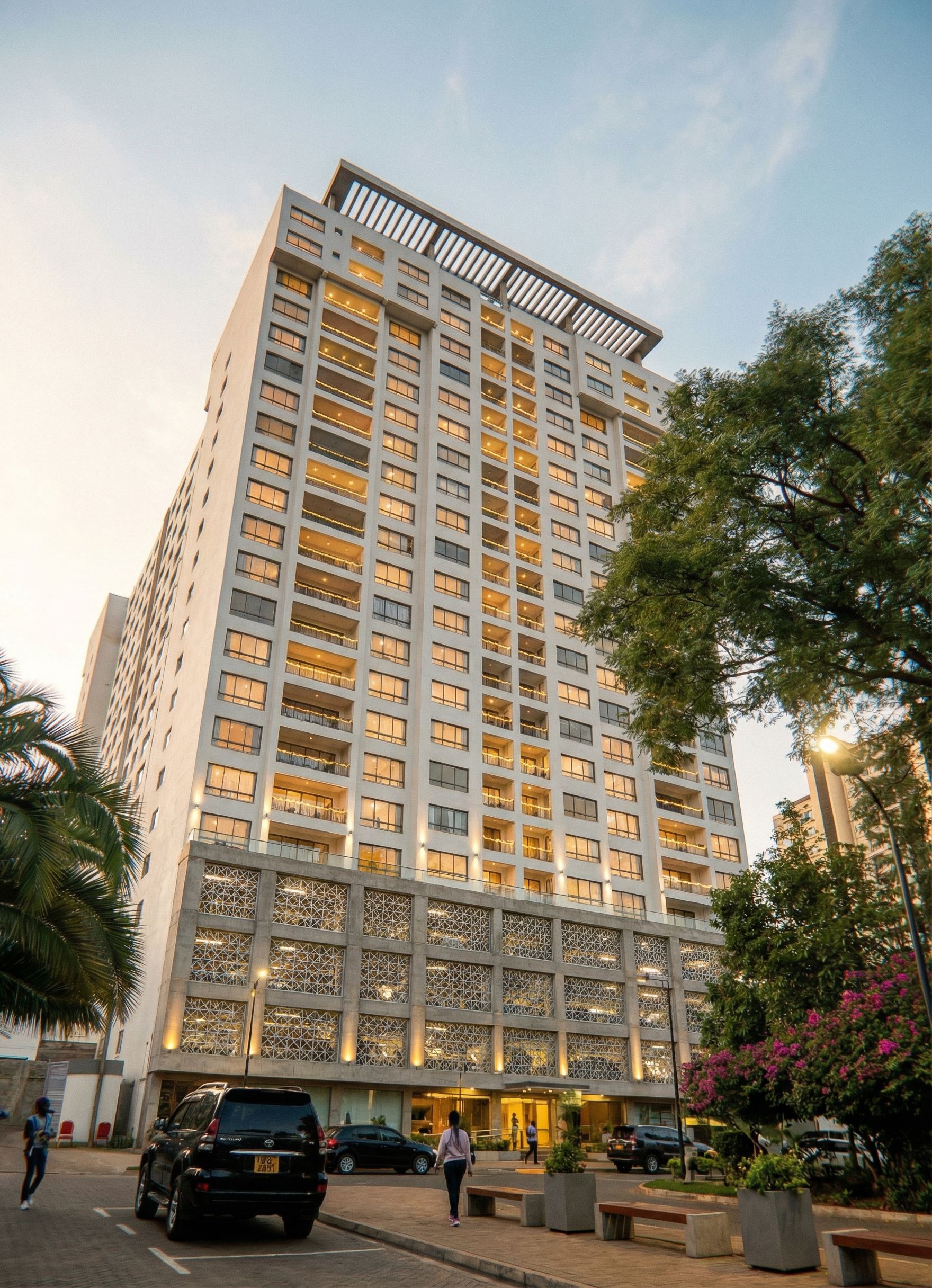 PromptRENDER OF A BUILDING IN MUTHAIGA AREA IN KENYA. USE WHITE WALL MASTER ON THE BUILDING. MAKE THE GLASS CLEAR, TRANSPARENT AND REALISTIC. INCREASE THE THE HEIGHT TWO WINDOWS ON EITHER SIDE BY ONE FLOOR as indicated in black . CONNECT THE TWO RESULTANT TOWERS BY A CONCRETE PERGOLLA PROJECTING SLIGHTLY OUTWARDS ON THE ROOF as indicated in blue. THE FIRST 4 LEVELS ARE PARKING LEVELS COVERED WITH ALUMINIUM LATTICE WORK FRAMED BY CONCRETE BEAM. Use rope lights, spot lights and street lights on the building. Turn on the lights in the building., keep exact camera angle
