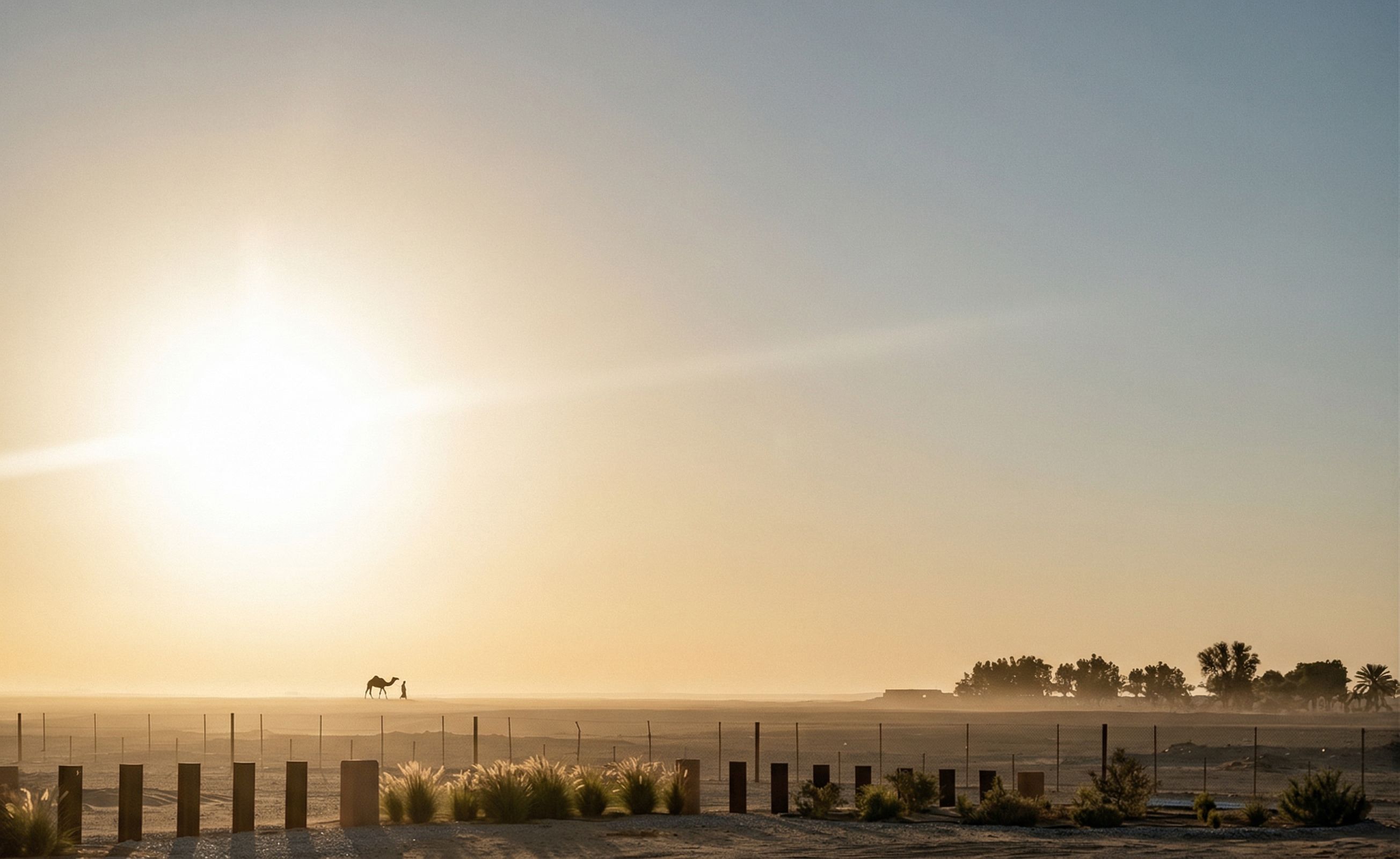 Add silhouette of a camal walking in the distance on the horizon, in the left side of the picture, keep exact camera angle