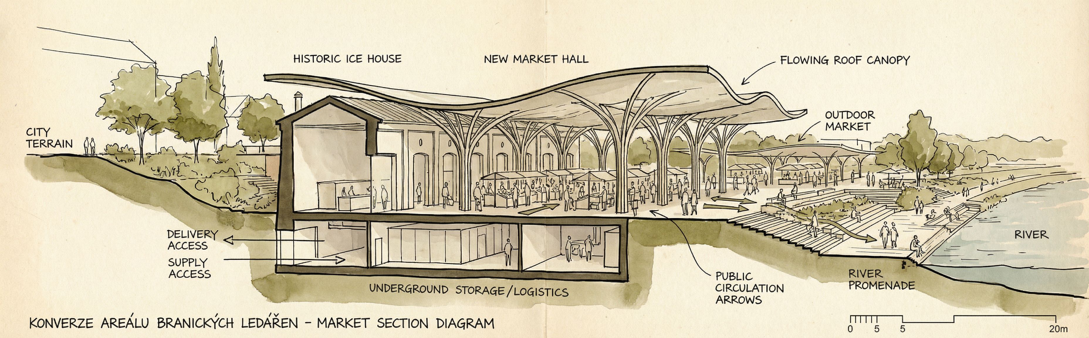 Create a clean architectural section diagram through a riverside market project at the Braník Ice House in Prague.