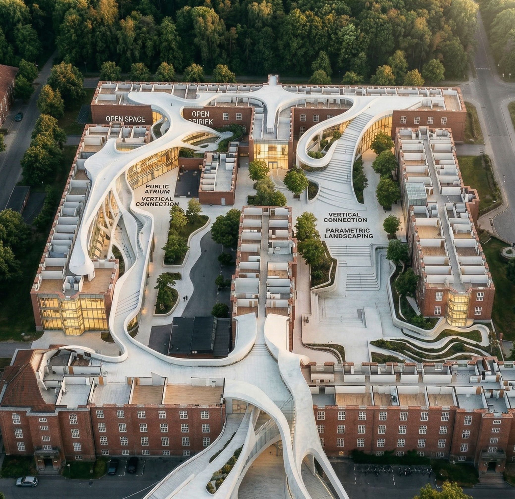 PromptCREATE A HORIZONTAL SECTION AT A LEVEL OF 1,5 METER ABOVE THE GROUND EXTERIOR, OF THIS BUILDING, BASED ON THE ATTACHED FLOOR PLAN OF REFERENCE IMAGE2., keep exact camera angle